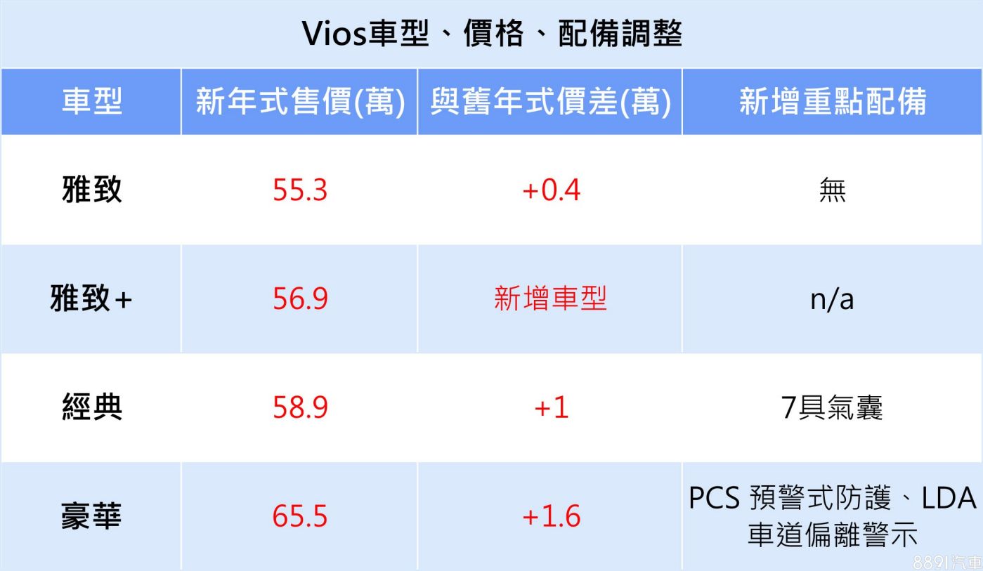 2021年式Vios車系同樣追加了二階的雅緻+,全車系達4車型編成:雅致、雅致+、經典和豪華,售價分別為55.3、56.9、58.9及65.5萬元,較先前漲幅範圍為0.4~1.6萬,配備方面亦小幅升級。