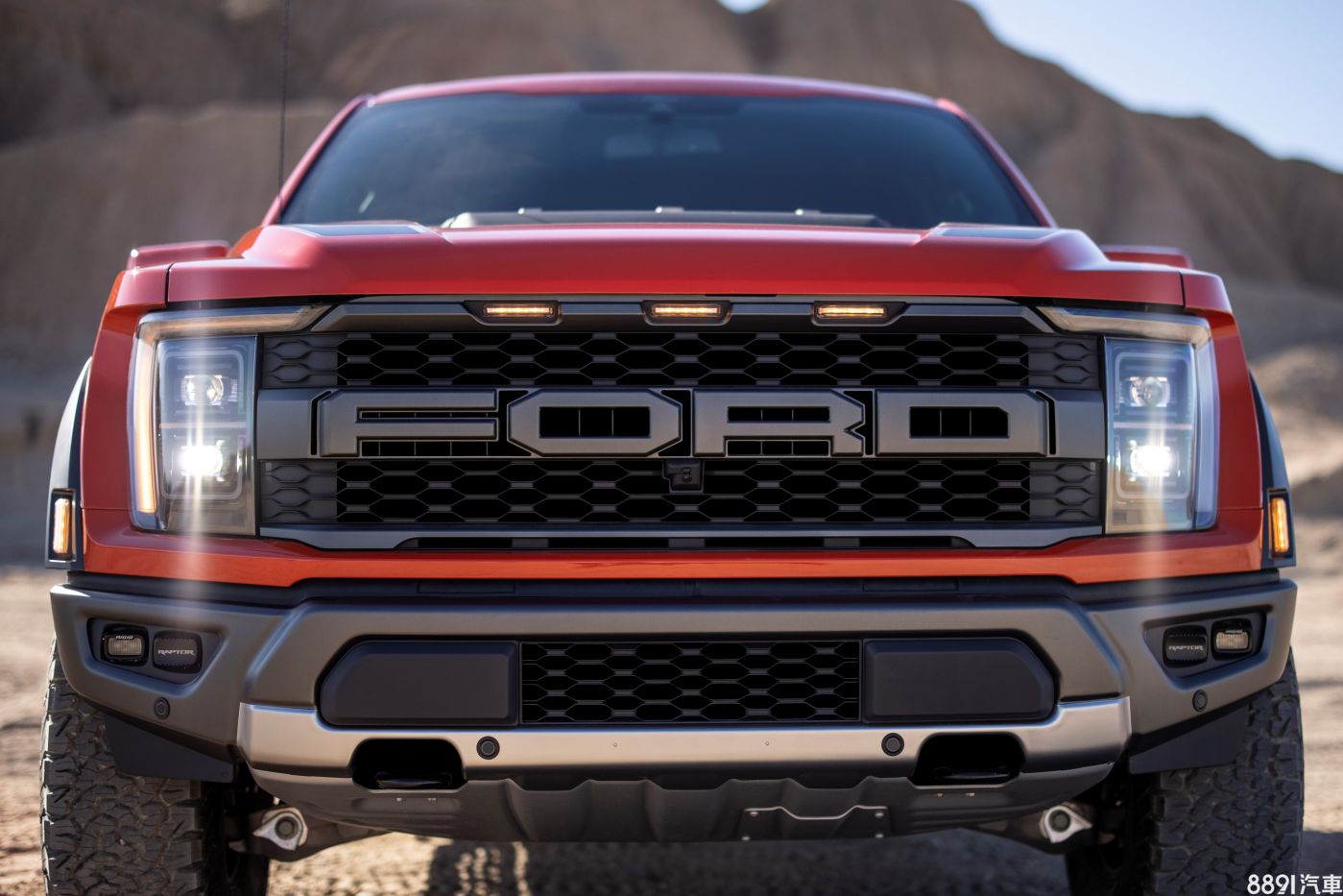 演化至第三代的福特F-150 Raptor,外觀以新款F-150為基礎,並施以外觀套件,車頭「招牌」的蜂巢狀水箱護罩,搭配碩大的「Ford」霧黑色字體、鋼製前保桿以及下擾流金屬護板等點綴,看來格外具侵略性。照明標配LED頭燈,另提供附主動遮蔽及轉向輔助的高階LED頭燈可選。