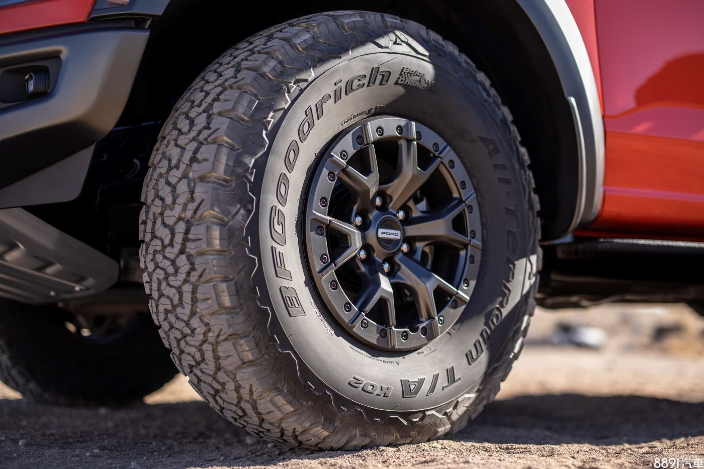 F-150 Raptor提供3種17吋鋁圈可作選擇,其中2種具備防脫框設計,輪胎標配35吋BFGoodrich All-Terrain T / A KO2全地形胎,另有37吋的升級選擇。當腳踩35吋輪胎時,進入角、離去角及穿越角各自為31度、23.9度與22.7度;若選配37吋輪胎時則依序為33.1度、24.9度與24.4度。