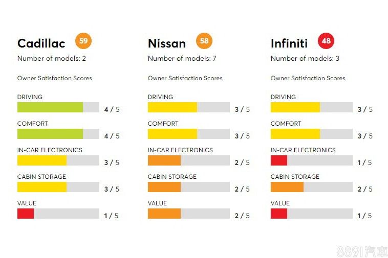 滿意度倒數三名的品牌則是Infiniti、Nissan和Cadillac,Infiniti及Nissan主要都是在車載系統、置物空間、物有所值三個方面表現較為弱勢,這邊要說明一下的是,調查中的置物空間,並非指行李廂表現,而是針對車室其他置物的規劃與設計。