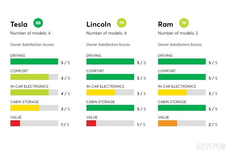 關於滿意度的評分,Consumer Reports將其分為五個項目統計,分別為:行車、舒適、車載系統、置物空間、物有所值,各項目再分5個等級,最高5、最低1,滿意度最高的前三名品牌分別為Tesla、Lincoln和Ram。