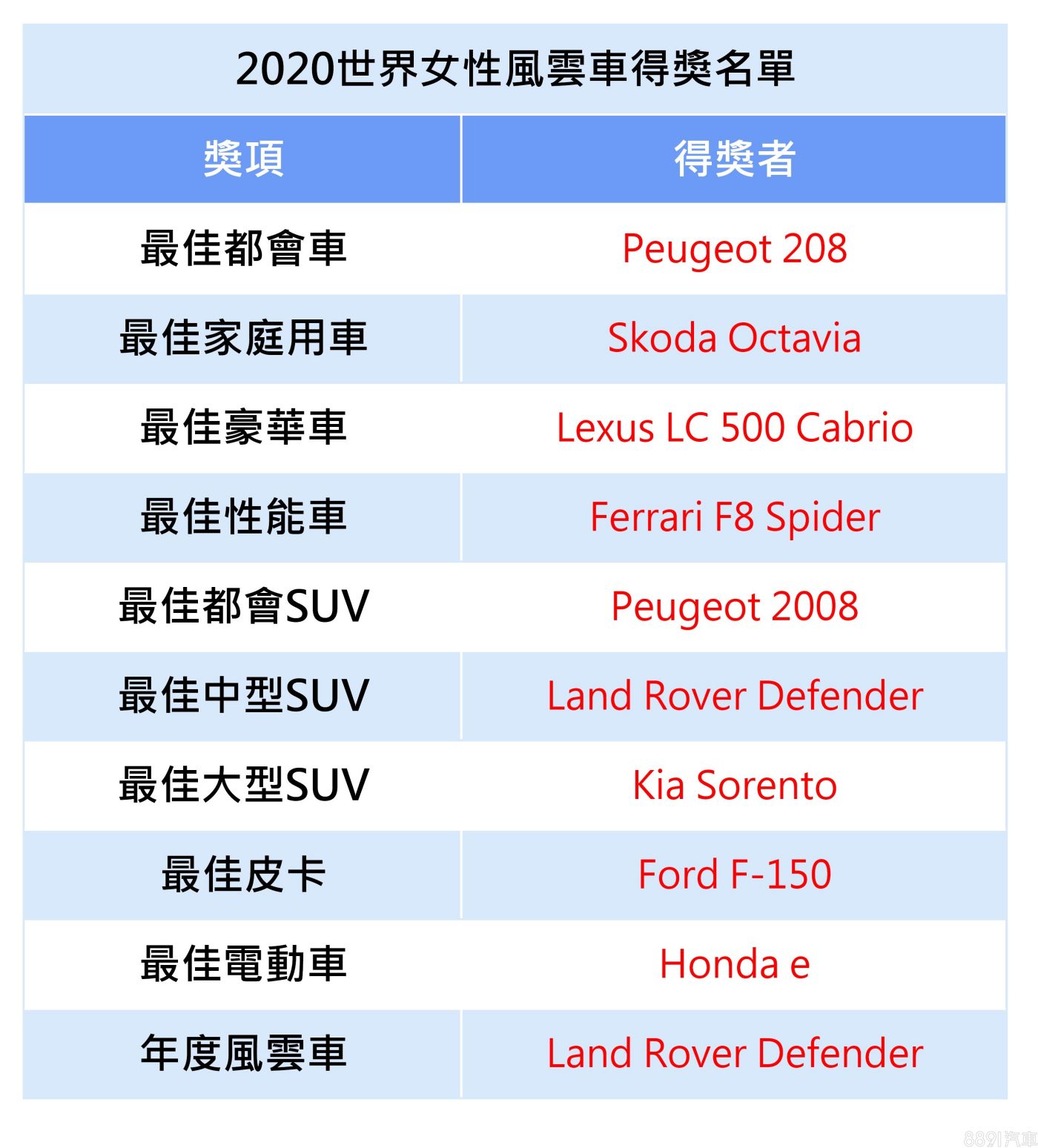 2020世界女性風雲車最終由Land Rover Denfender脫穎而出,而評審認為Denfender除了內外設計有特色、高安全性之外,也跳脫純種越野車框架,更加注重一般道路的乘坐舒適度與實用性。