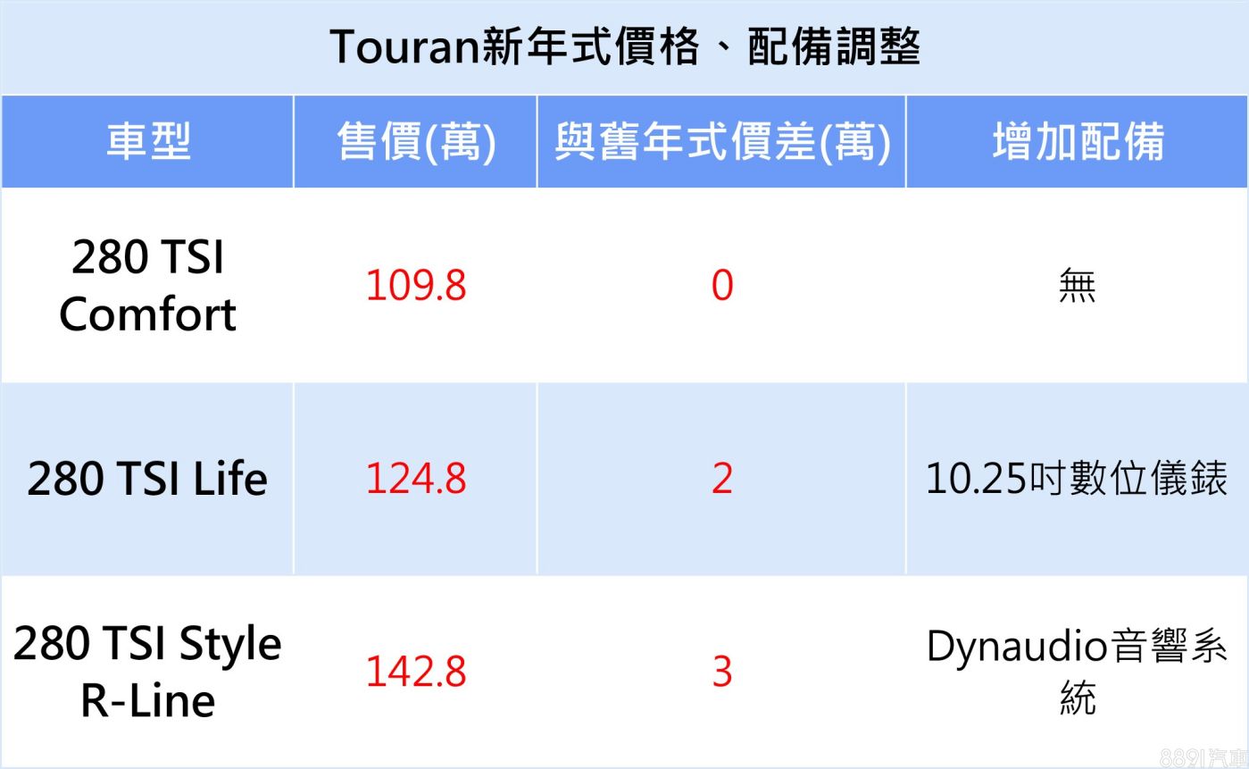 而新年式Touran車系,維持3車型編成:280 TSI Comfort、280 TSI Life和280 TSI Style R-Line,售價分別為109.8、124.8與142.8萬元,280 TSI Life和280 TSI Style R-Line分別有著2、3萬之漲幅。