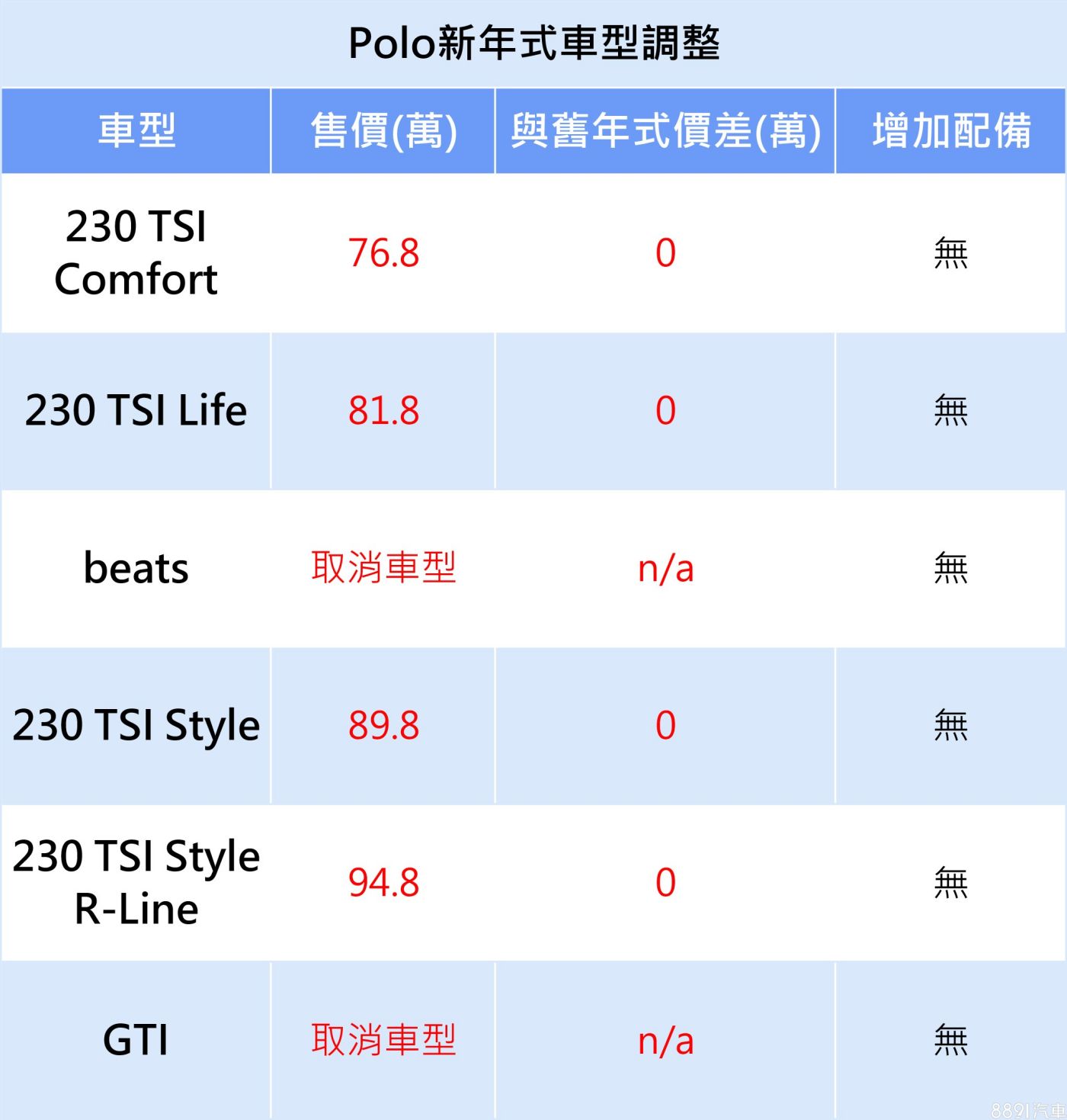 新年式Polo車系取消了beats和GTI車型,提供230 TSI Comfort、230 TSI Life、230 TSI Style、230 TSI Style R-Line,正式售價分別為76.8、81.8、89.8、94.8萬,價格方面並未變動。