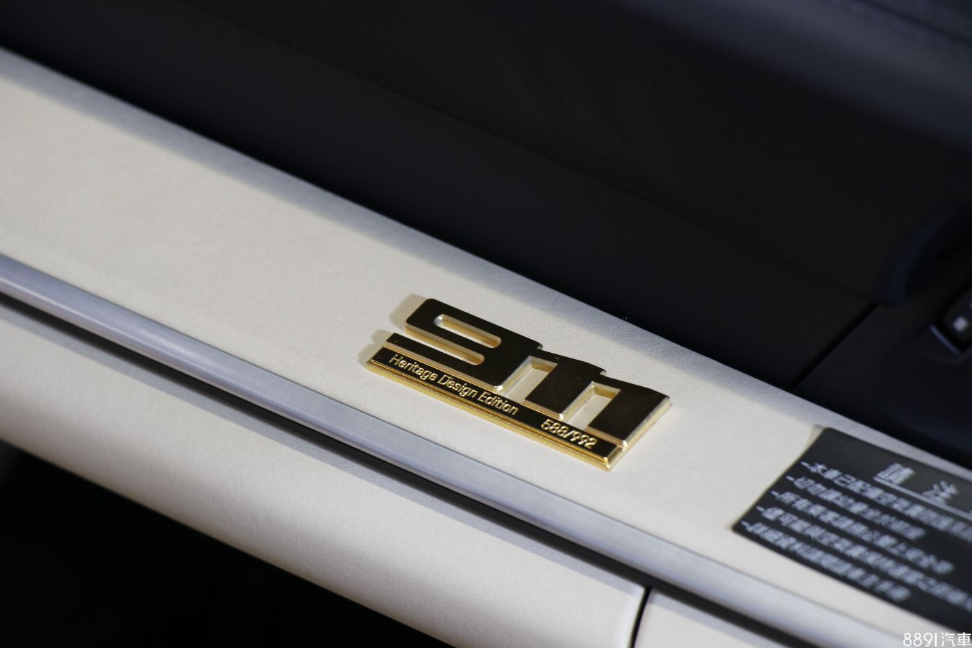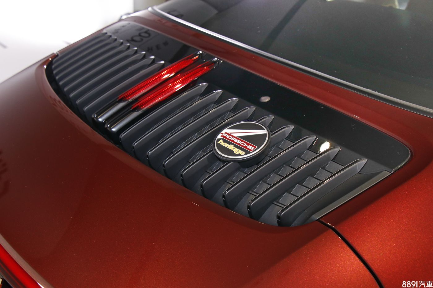 後方引擎室散熱孔上的Porsche Heritage徽飾,造型設計參考當年保時捷356車主達成10萬公里行駛紀錄所獲得之獎章,也是Heritage Design車款的共同特徵。