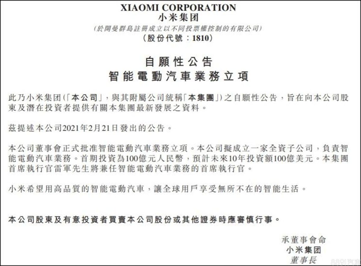 事實上,早在今年2月21日,小米集團就曾向股東會發出「智能電動汽車業務」的公告,將成立全資子公司的方式專營電動車事業,由雷軍兼任該公司執行長,首期投資100億人民幣,並預計未來10年投資額100億美元,目標是打造高品質的智能電動車。