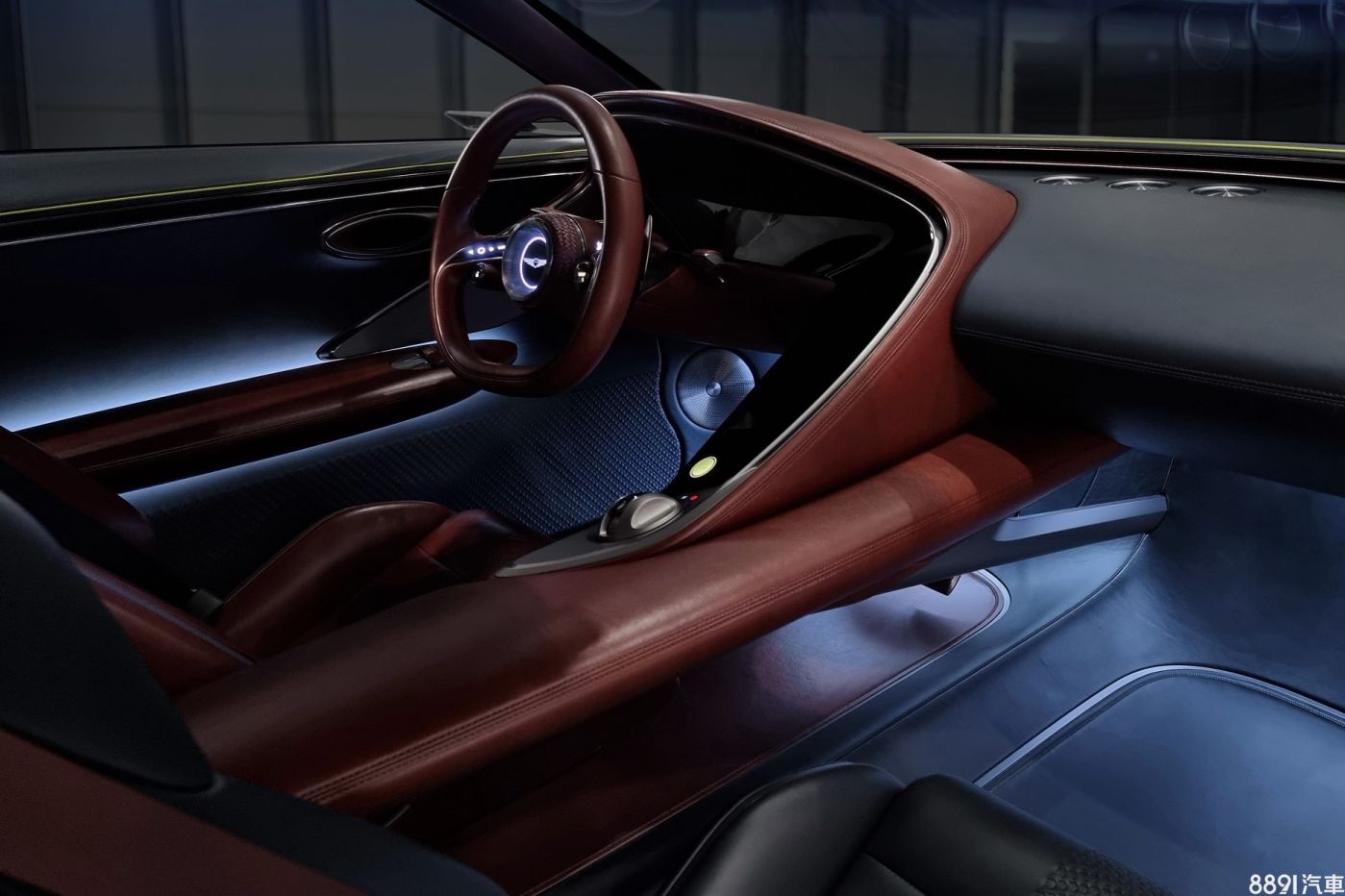 Genesis X採用駕駛者導向的車內鋪陳,高聳的中控台與中央扶手,包圍感強烈,並特別在駕駛側用上褐色皮革,乘客側搭海藍色來區隔彼此,車內用料除了高檔的皮革外,也運用不少再生材料。