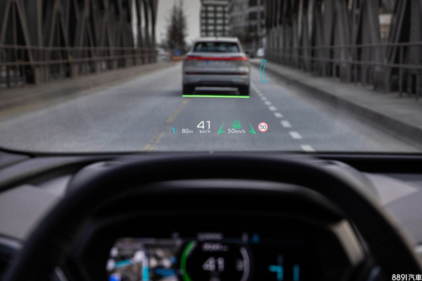 11.6吋MMI多媒體系統及10.25吋數位儀錶都已是品牌常見的科技配備,Q4 e-tron還導入擁有AR技術的HUD抬頭顯示幕,可搭配駕駛輔助系統和導航使用,加上處理器與攝影鏡頭、雷達的即時反應,能以極快的速度,提供相關時速、速限等車輛資訊。