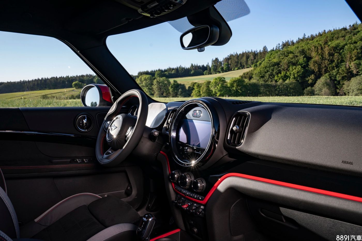標配含轉向輔助燈的新式樣LED頭燈、LED日行燈、「招牌」英國旗造型LED尾燈、前四活塞Chili Red塗裝煞車卡鉗、加大口徑的雙出跑車化排氣尾管等,當然顯其身分的JCW徽飾也沒少。