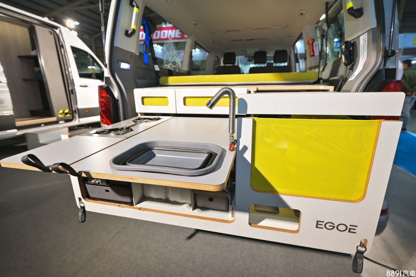 採模組化設計的露營套件可嵌入T6.1 Caravelle 150 L長軸車型的後廂,於上層提供雙人床架及床墊組,下方櫥櫃除了基本收納功能外,也包含雙孔瓦斯爐及水槽供戶外炊煮所需。