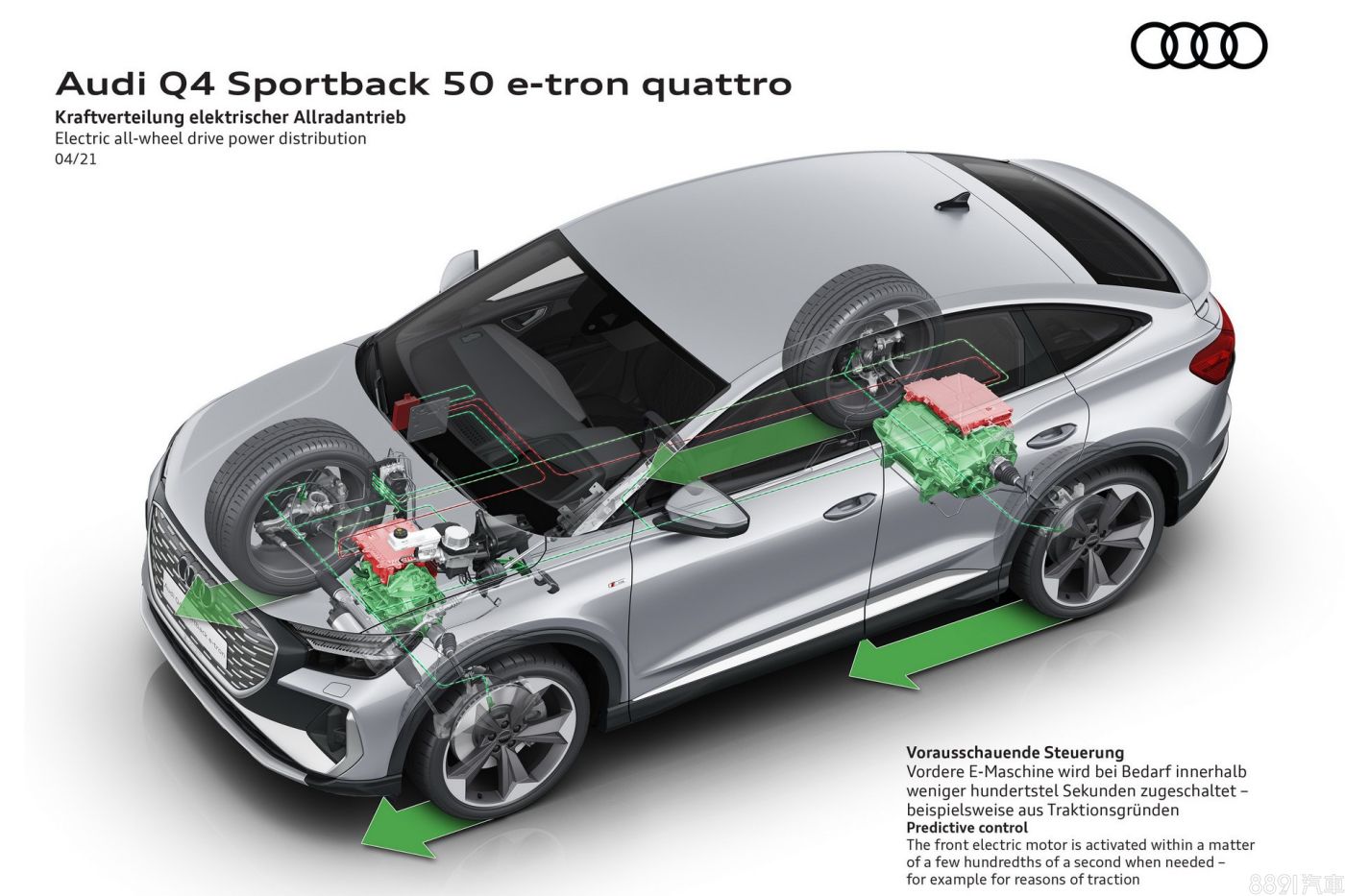 頂規50 e-tron quattro則於前、後軸各一具馬達,綜效輸出來到295hp/46.9kgm,電池規格則同中階款為77kWh。頂規也將破百加速時間縮減至6.2秒,不過續航力不若40 e-tron,Q4及Q4 Sportback為488km和497km。