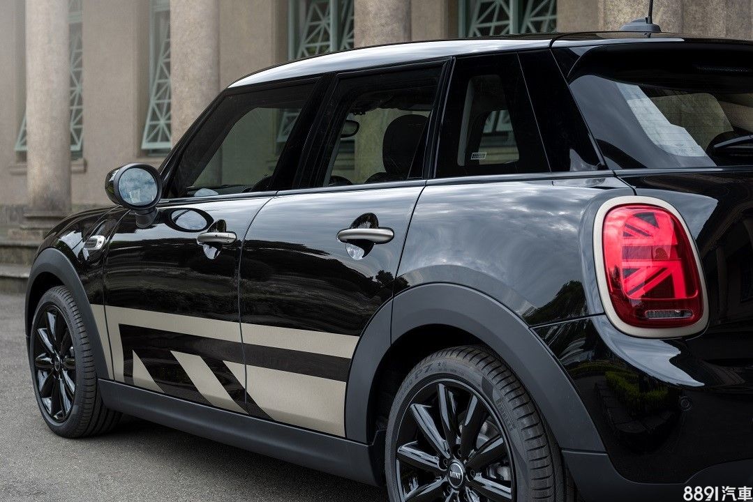 車門下緣大面積黃銅色英國旗幟圖案,輔以黑色高光澤處理環窗腰線、17吋黑色鋁圈,為車側增添不少視覺亮點。