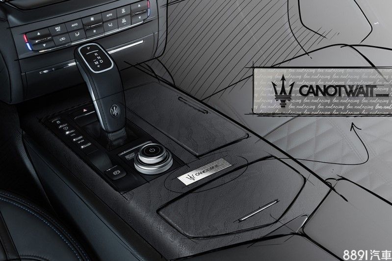 車側部分除了換上訂製20吋消多輻式光黑鋁圈外,葉子板還藏有亮點,在瑪莎拉蒂招牌的「鯊魚鰓」散熱孔上方,鑲嵌上CANOTWAIT的品牌Logo,藉此凸顯聯名款的獨特身分。