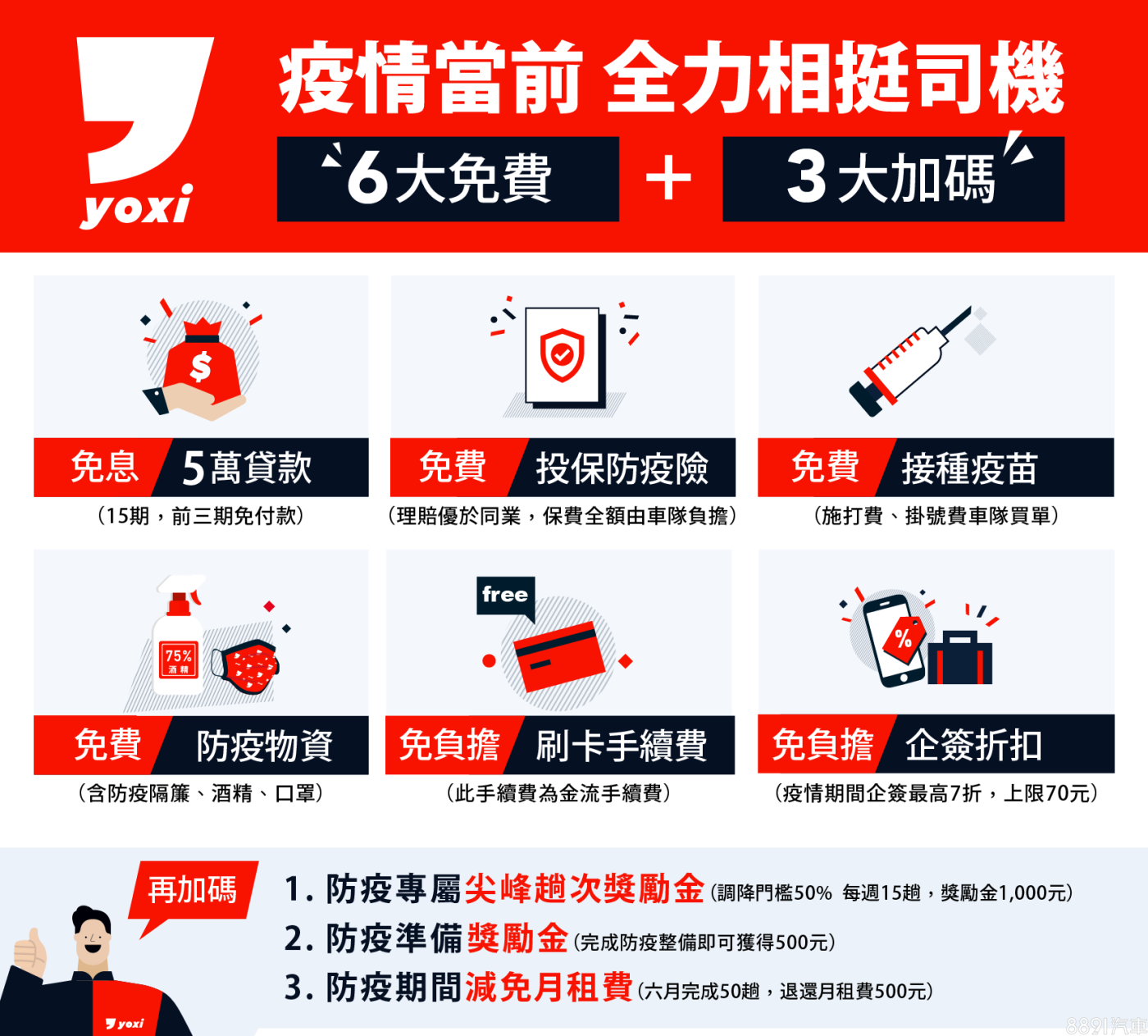 加碼二:獎勵金補助司機一同防疫,yoxi司機如落實防疫措施,如每日測量體溫、勤洗手、正確配戴口罩、每日進行全車消毒清潔,另外也要求司機下載【臺灣社交距離】App,注意接觸狀況,並迅速上架實聯制,協助政府疫調工作,yoxi將補助5/31號以前完成防疫措施的司機500元的獎勵金。