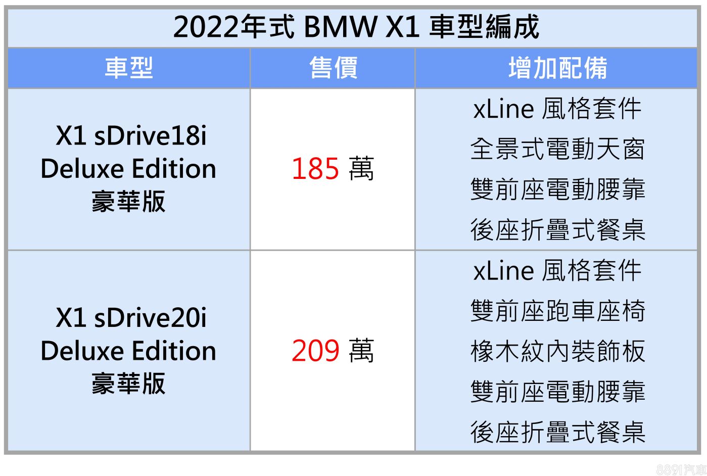 2022年式X1自即(4)日起正式在台開賣,維持X1 sDrive18i及X1 sDrive20i兩種車型選擇,並隨新年式皆冠上「Deluxe Edition 豪華版」名綴,雖說新增配備,不過價格仍分別維持185萬及209萬的原售價。