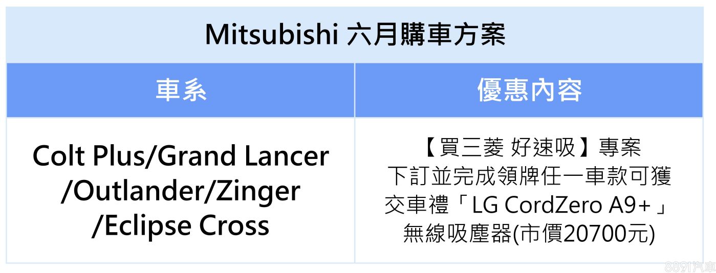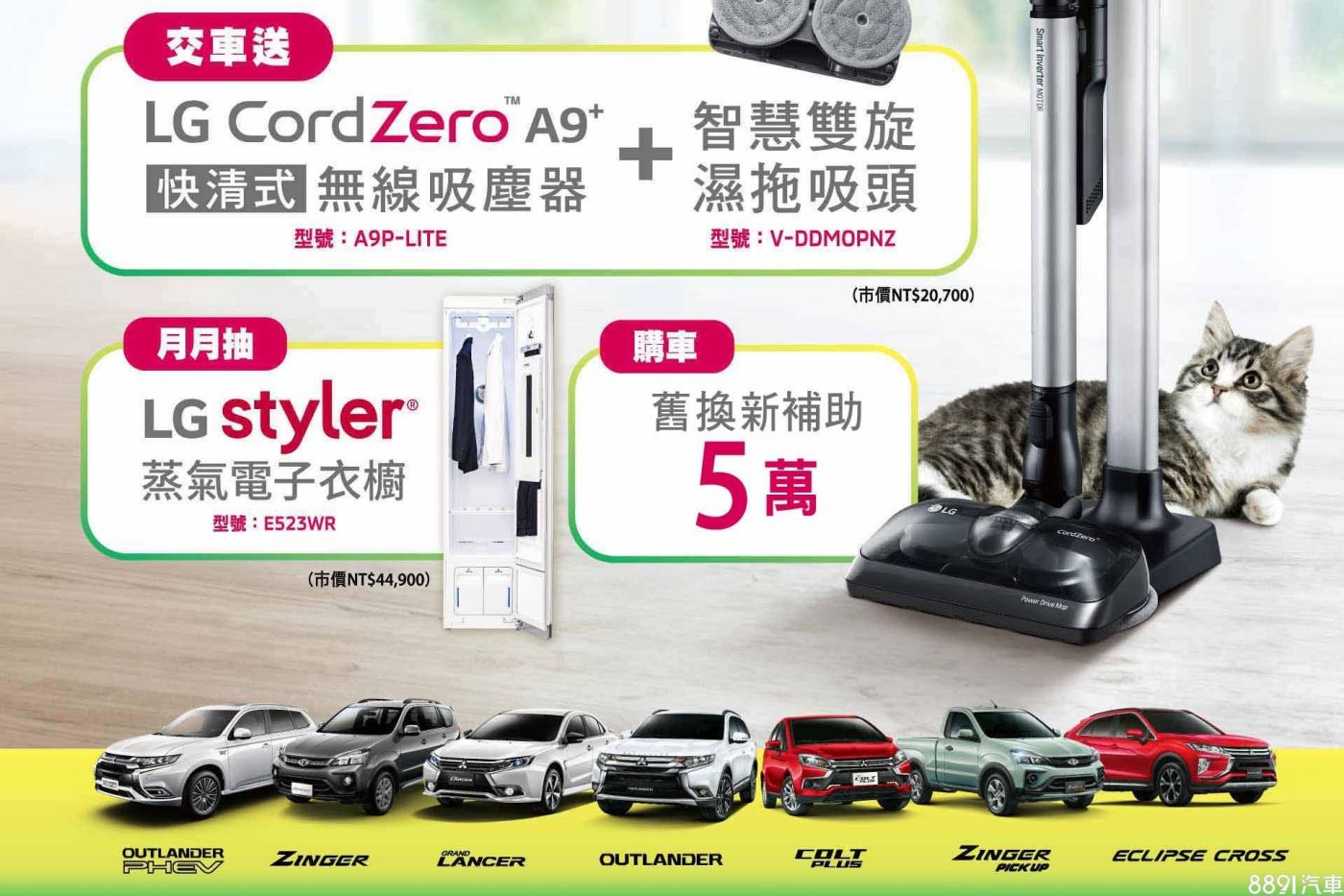 中華三菱六月推「買三菱 好速吸」購車活動,本月底前購買Colt Plus、Grand Lancer、Outlander、Outlander PHEV、Eclipse Cross、Zinger、Zinger Pickup等車款並完成領牌者,即可獲得市價20700元交車禮「LG CordZero A9+快清式無線吸塵器+智慧雙旋濕拖吸頭」。