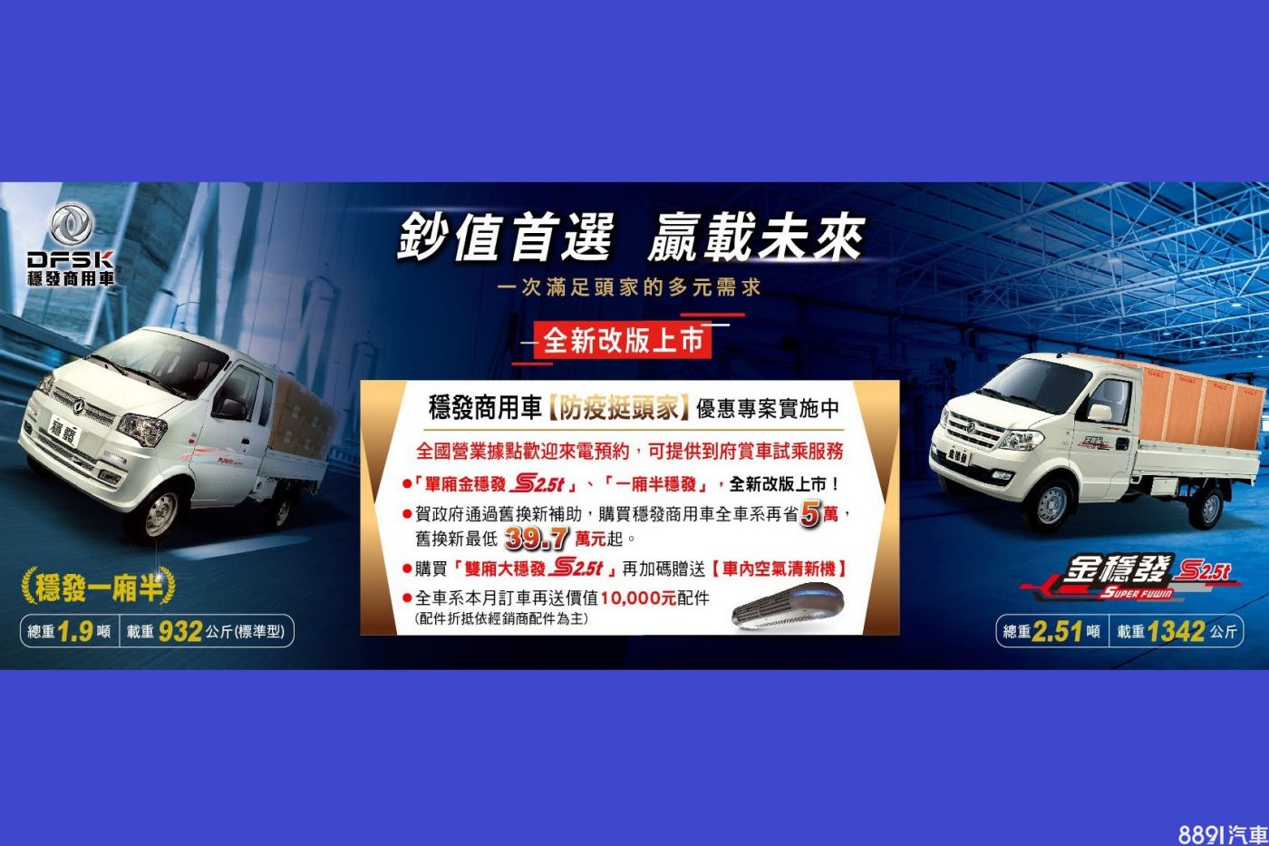 此外,亦同步推出「防疫挺頭家」優惠專案,購買穩發商用車全車系,舊換新省5萬,最低39.7萬元起;購買雙廂大穩發S2.5t、加碼贈車內空氣清新機;全車系本月訂車再送價值10000元配件。