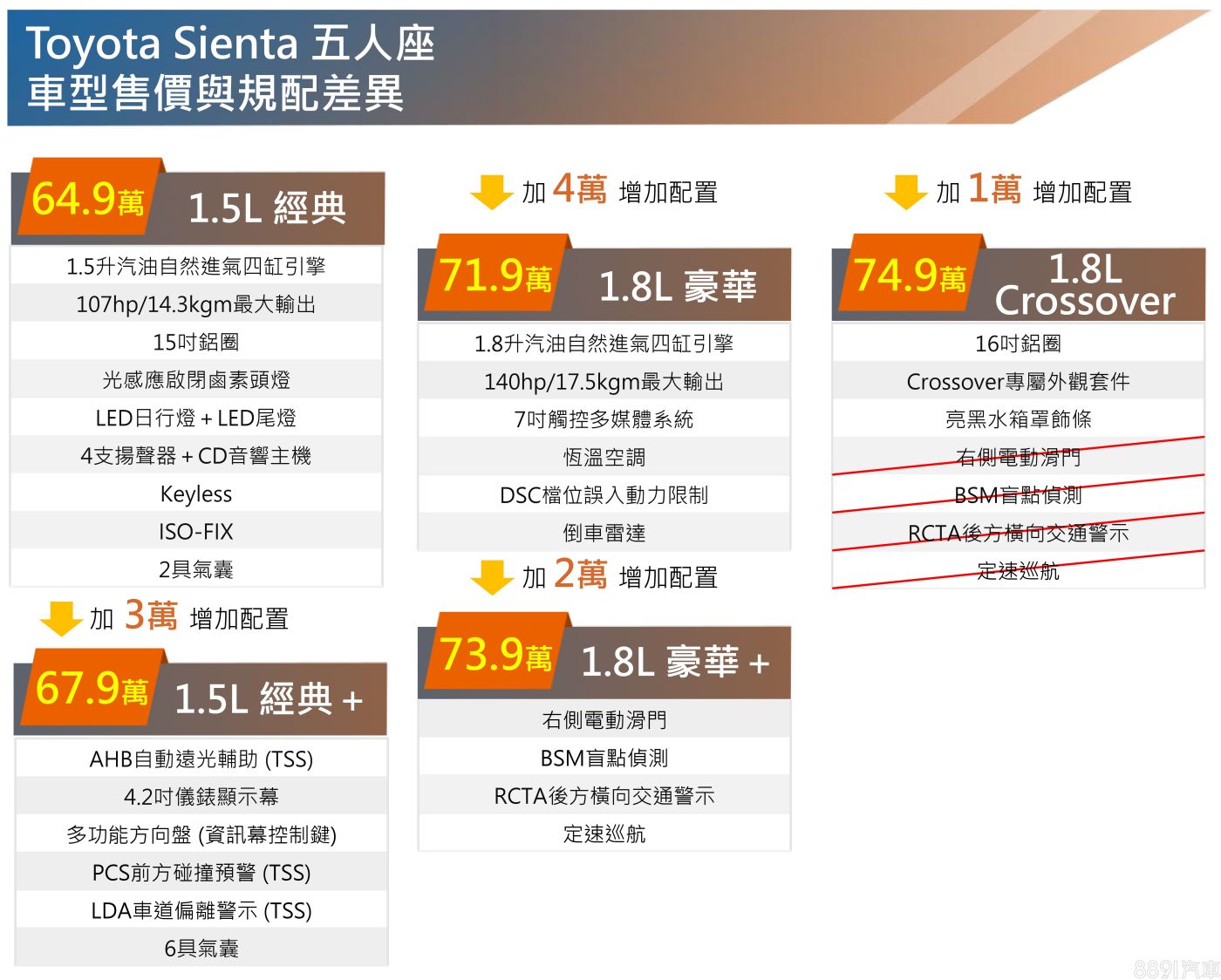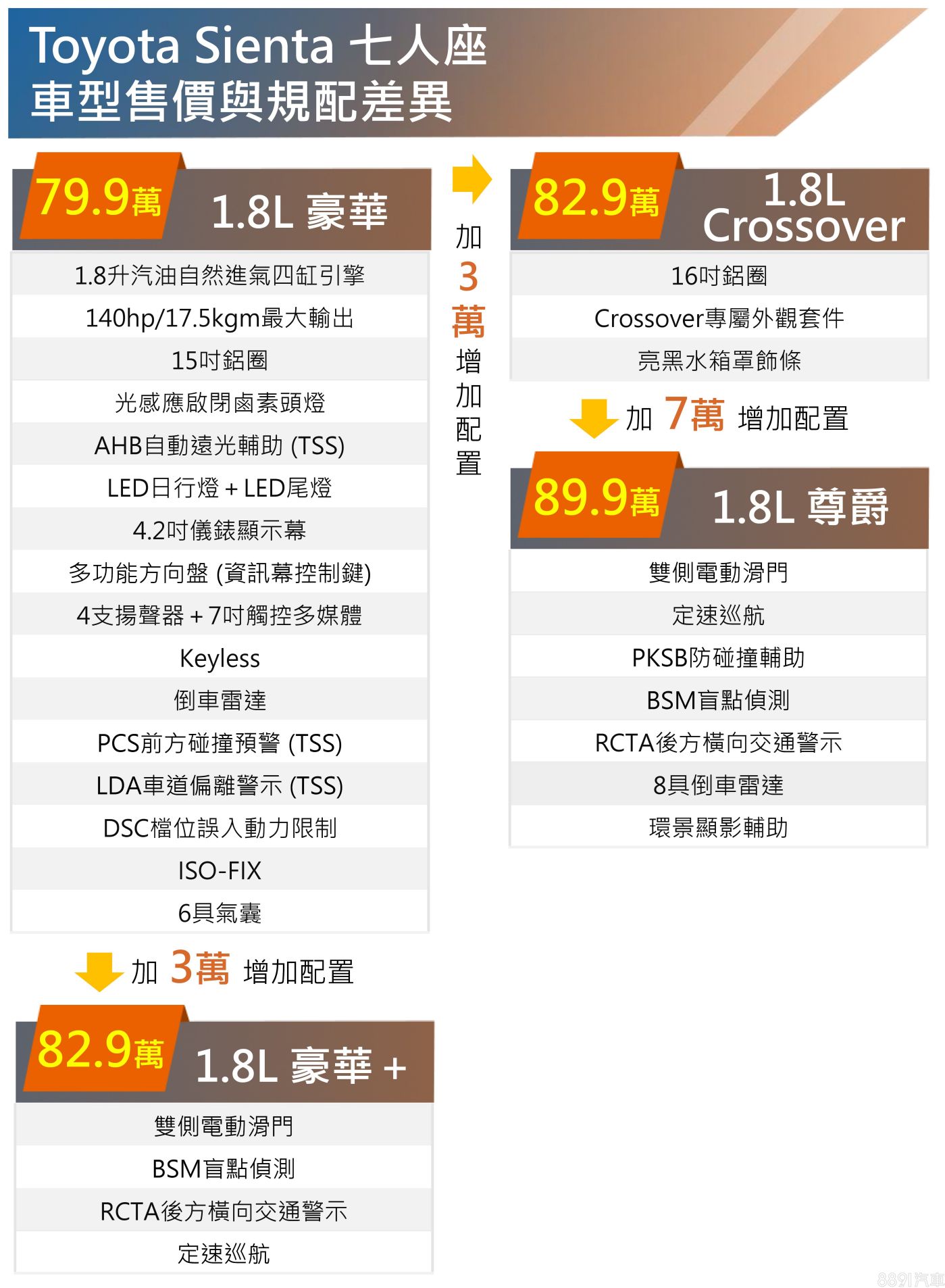 以空間靈活性著稱的Sienta,提供五座和七座車型,具備多樣的收納設計和方正的車室空間,加上MPV低門檻的優勢,讓上下車和裝卸行李廂皆較為便利,尤其對需要攜帶嬰兒車和照護用品的新生兒家庭而言更加有感。小改款後入門款外配備PCS及LDW,不過更建議標配BSM及RCTA的「豪華+」,比起售價相當但安全輔助沒那麼完整的跨界版本,較適合做為家用選擇。