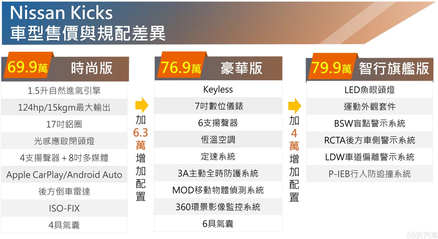 對於新婚或剛迎接新生兒的家庭,通常年紀較輕,預算上也較有限,時下流行的跨界小休旅便成了合適的購車考量。其中空間及安全輔助表現屬同級前段班的Kicks,以不及80萬的售價,有著1.5升低稅金和不錯的能耗表現,乘坐舒適性佳,多媒體系統也支援智慧手機連結,而安全輔助系統較為完備的頂歸款,更是車系中較推薦的選擇。