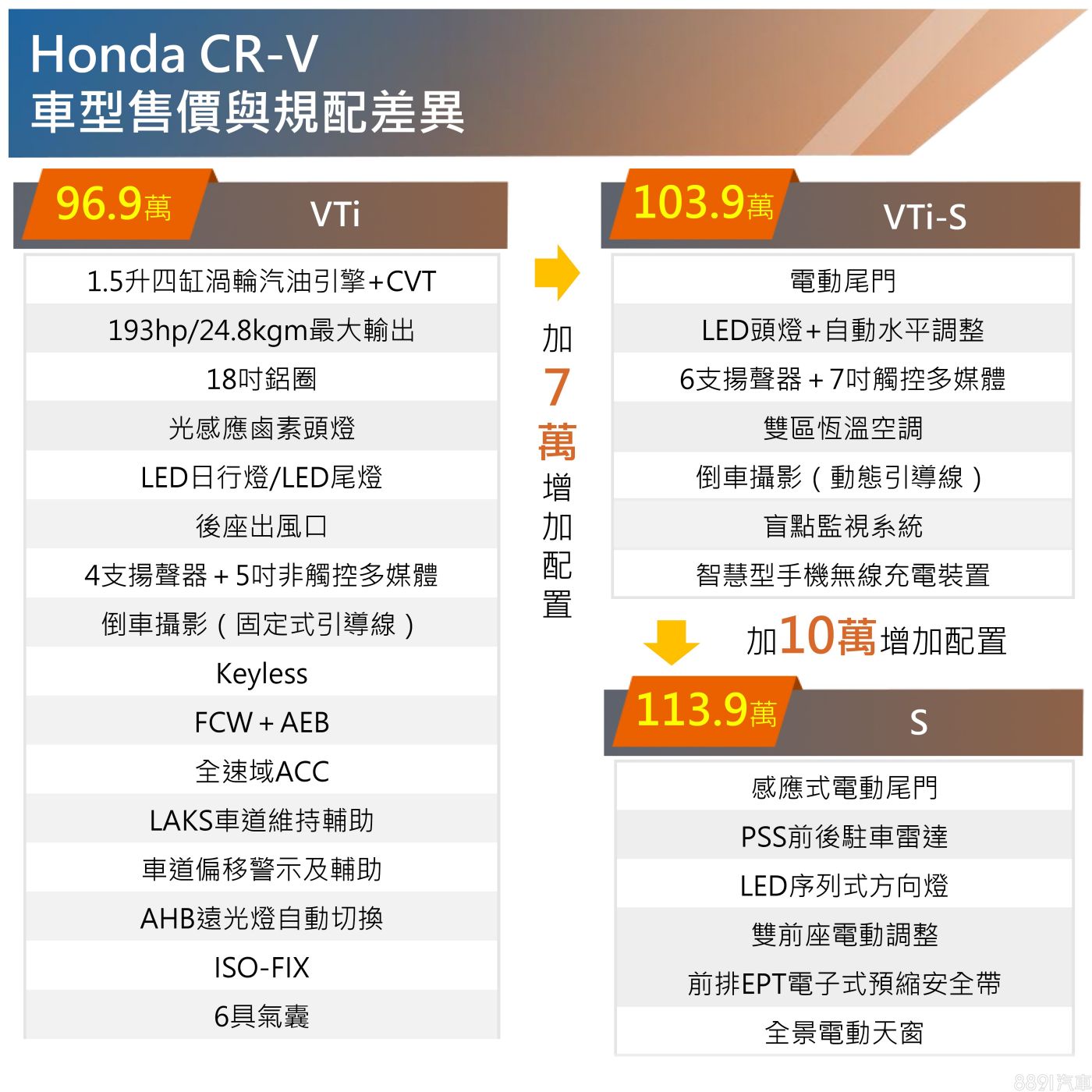 CR-V一直是相當熱門的國產中型休旅,寬大、無壓迫的後排空間更是其最大的吸引力,為後座乘客提供不錯舒適性。車系去年推出小改款後,補回了百萬內的VTi入門款外,並將Honda Sensing列為全車系標配,同時也針對較高規車型新增電動尾門、無線充電座和電動調整雙前座等實用配備,更貼近家庭用車所需。