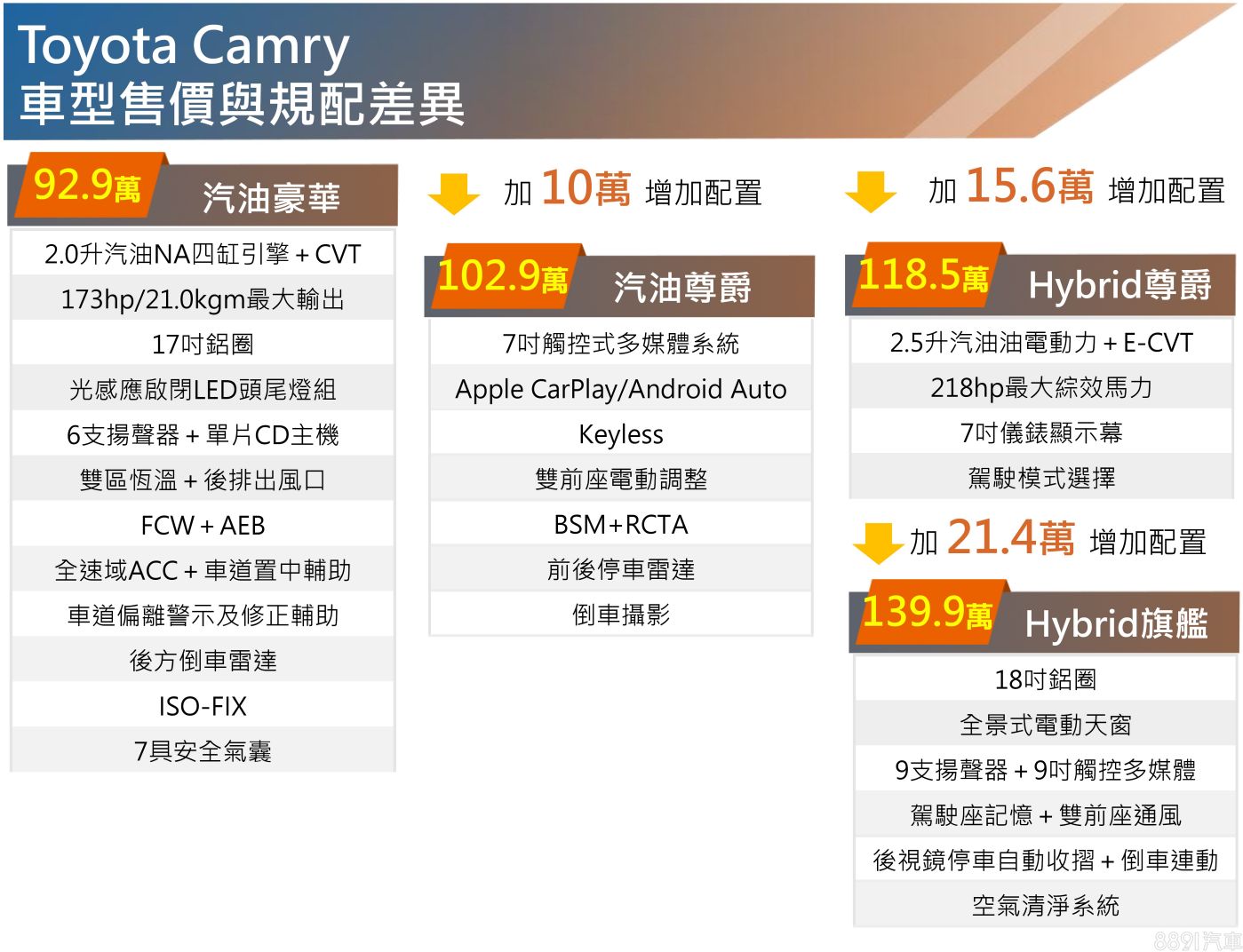 面對更重視後排舒適性和行李廂空間的四人家庭,Camry來對應可謂游刃有餘,今年首季上市的小改款,全車系標配TSS 2.0系統,擁有更靈敏的前方碰撞預警,並追加全速域ACC和LTA車道置中輔助。此外,汽油款隨更新將排氣量縮減至2.0升,除了降低稅金負擔,入門的豪華型更將售價下修百萬內,提高不少C/P值。