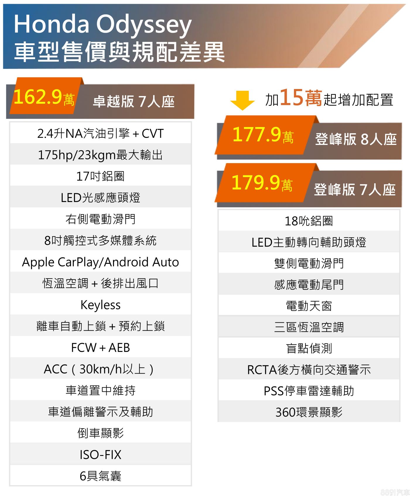 提供七座或八座車型的Odyssey,上市後便受到許多大家庭的歡迎,不僅比起5+2座大型SUV空間更寬敞舒適,MPV低門檻的特色便於一家老小上下車,尤其3月初推出二度小改車型後,新造型普遍獲得正面評價,Honda Sensing入列全車系標配,其中較高階的登峰款,補上盲點偵測、自動停車及360環景顯影等配備,會是更推薦的車型選擇。
