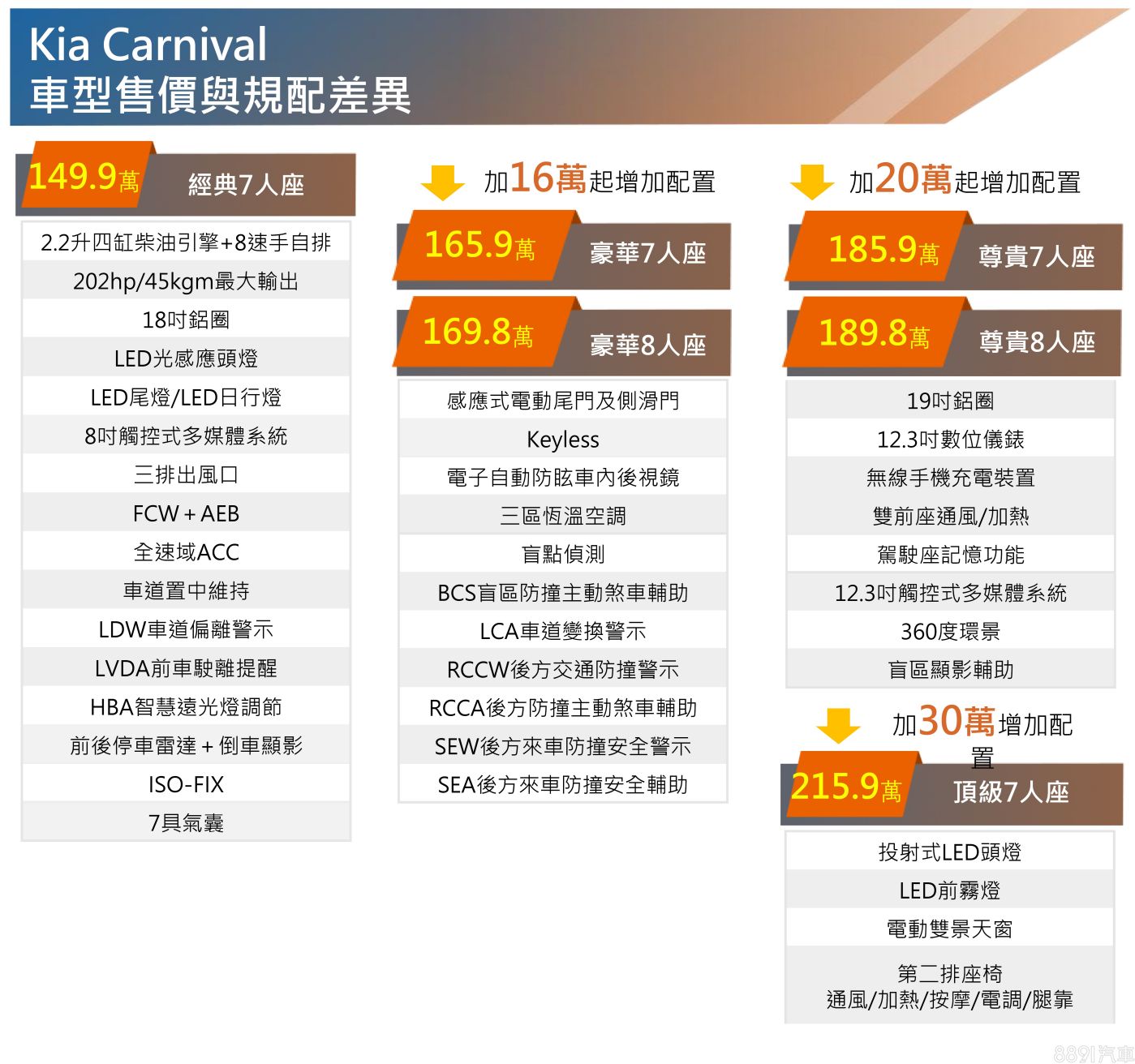 以Odyssey的價格提供Sienna的空間,一向是Carnival最具吸引力的特點,4月中旬在台開賣的大改款,打出150萬有找的低門檻,同樣提供七座或八座配置,2.2升柴油動力在同級中具稅金優勢,14.4km/L的油耗表現亦不差,並全車系標配全速域ACC、車道置中維持等駕駛輔助機能,在進口MPV市場中無疑是「俗又大碗」的划算選擇。