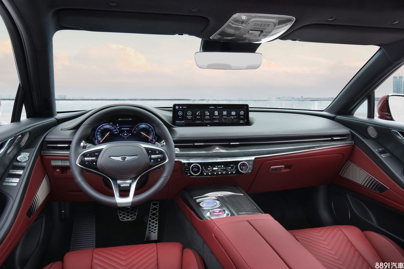 G80 Sport內裝同樣配合主題略做小幅變化,將G80的四輻式方向盤換為三輻款,木紋飾板也改為碳纖維樣式,並具備專屬座椅縫線造型。車室除了預覽車型的紅黑雙色搭配外,另有「純黑內裝+灰縫線」和「純黑內裝+紅縫線」兩種風格可選。