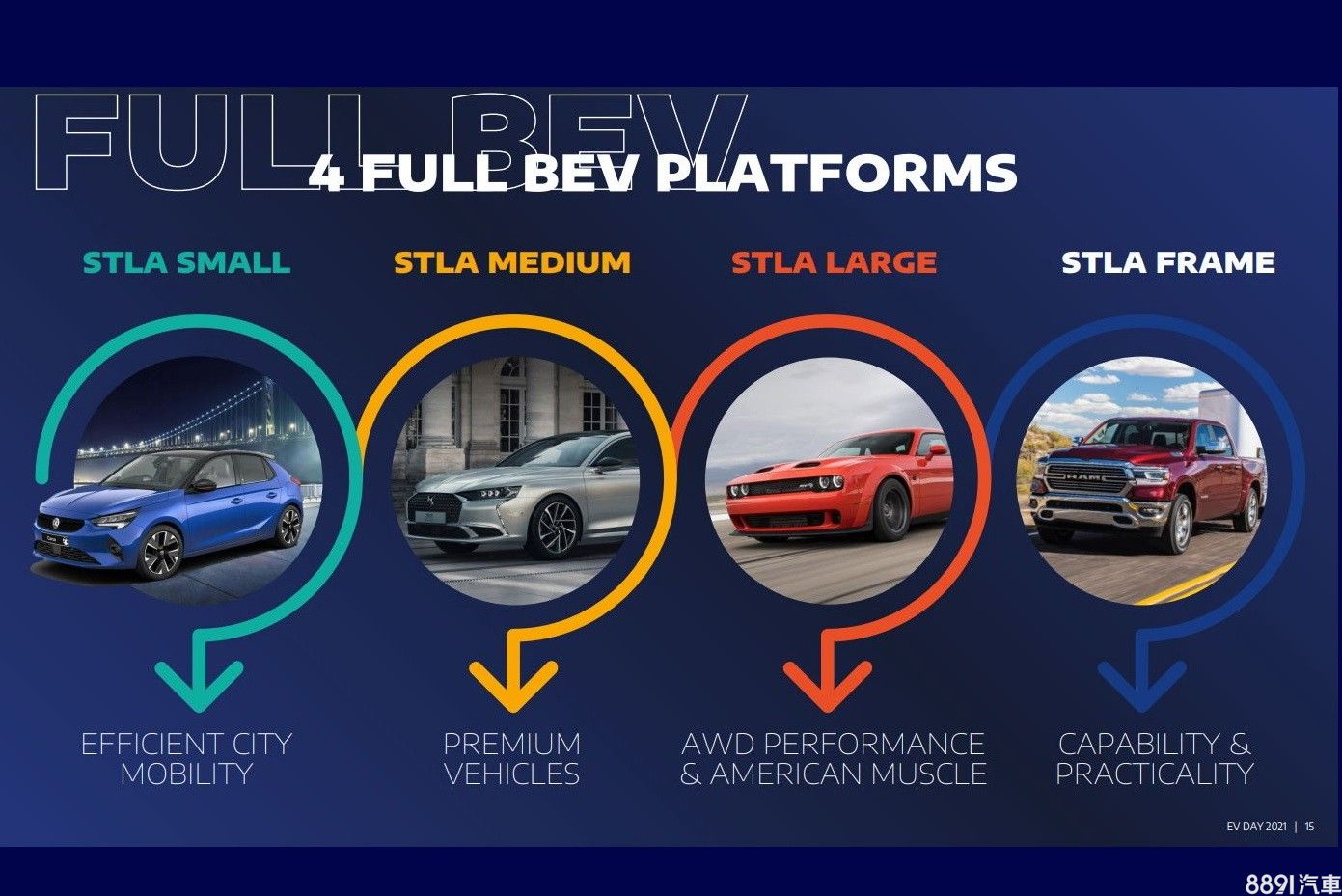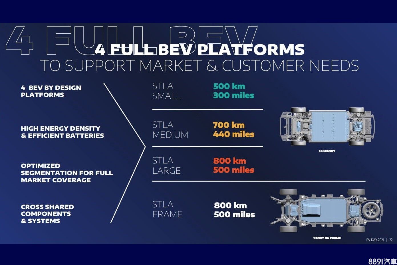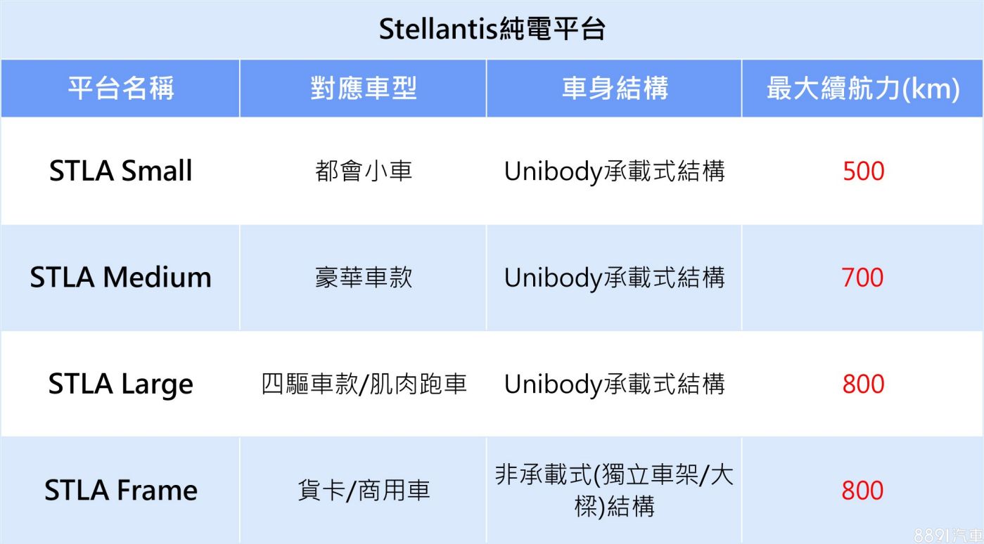 用以打造車長在4米左右都會小車的STLA Small平台,兼容37~82kWh容量的鋰電池組,最大續航里程為500km;針對中大型豪華車款的STLA Medium平台,則可配置87~104kWh容量的鋰電池組,最大續航里程為700km;至於適用集團旗下美式肌肉跑車、大型四驅車款的STLA Large平台,可搭配110~118kWh容量之鋰電池組,擁有800km的最大續航力;最後是專為貨卡與商用車設計的STLA Frame平台,搭載159~200kWh容量之鋰電池組,可繳出800km之最大續航成績。