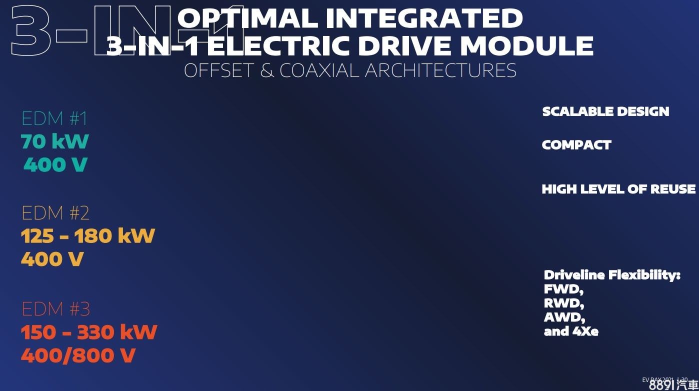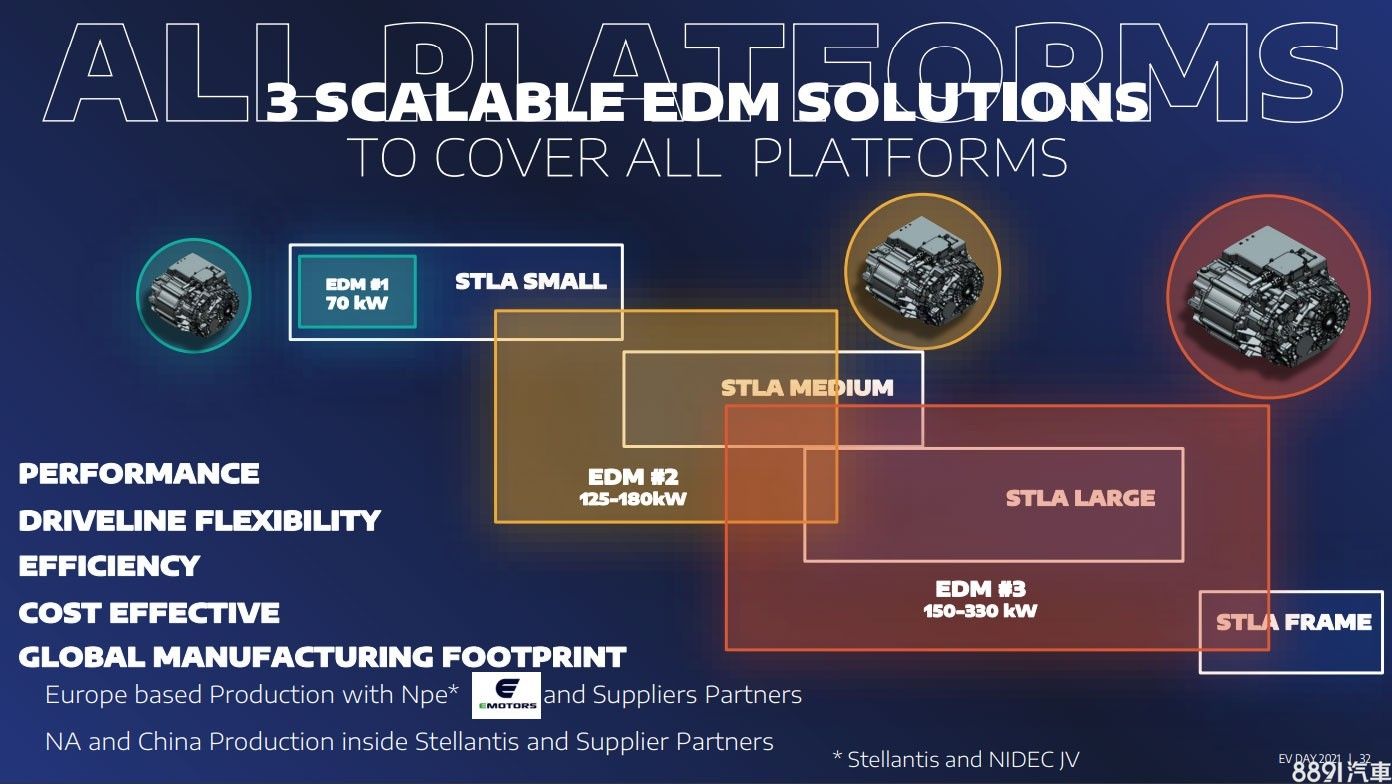 除了四款新平台,Stellantis也推出三款純電動力,大致架構均為電動馬達、變速系統、變壓器等,可對應前驅、後驅、四驅等配置,EDM #1和EDM #2均搭配400V電壓系統,前者輸出約94hp、後者輸出範圍則在168~241hp;EDM #3則除了400V,亦適用800V電壓系統,輸出範圍在201~442hp。