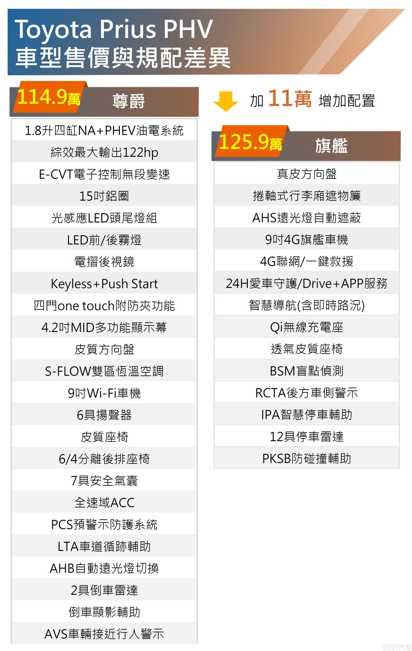 Prius PHV新增一款入門的尊爵版,建議售價114.9萬,同時推出限量30台、含舊換新99.9萬的超值方案,頂規的旗艦版維持原售價125.9萬。