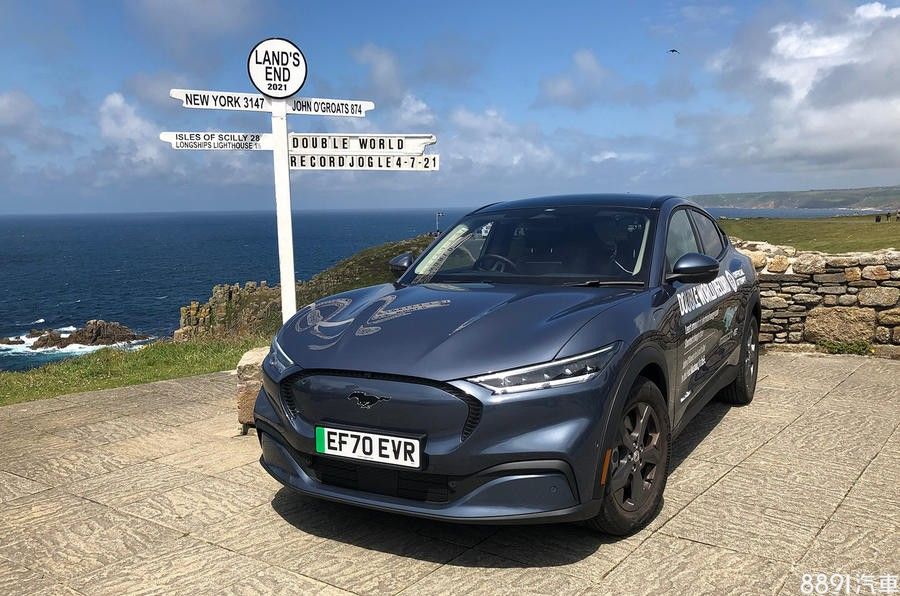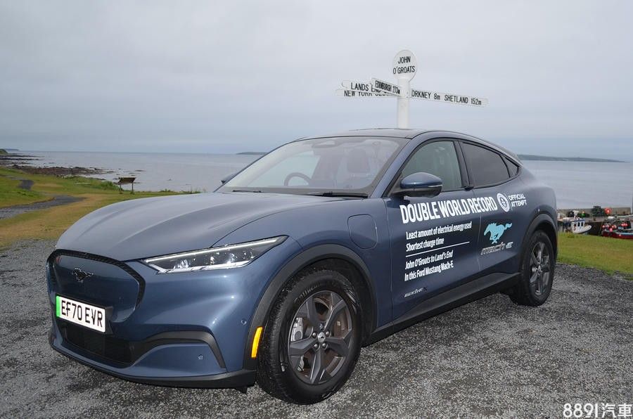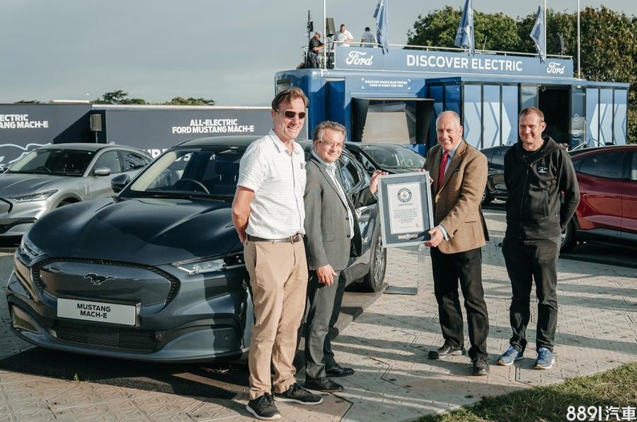 這項紀錄是由三名英國BBC記者在7月3日所創下,三人從英國最北端John o’ Groats出發、歷經1344km路程與27個小時抵達英國最南端Land’s End,其中僅停留兩次休息時間替車輛充電,兩次充電時間加總也僅有45分鐘,以最短充電時間完成這趟長征。經過計算,這輛Mustang Mach-E平均每度電(kWh)行駛里程高達10.46km,平均車速則為49.6km/h。