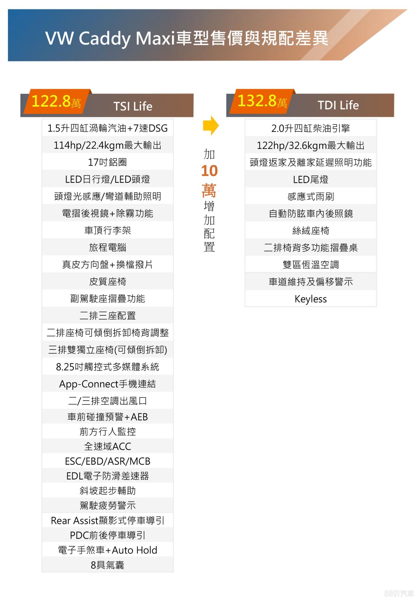 大改款Caddy Maxi提供TSI Life、TDI Life兩動力車型,分別開出122.8、132.8萬元之售價,較預售下修幅度有6萬之多,此外,原廠特別祭出「上市心動價」,只要於8/15前訂車、並於今年12/31前交車,TSI Life和TDI Life分別可享3、4萬元的折價優惠,為119.8和128.8萬元。