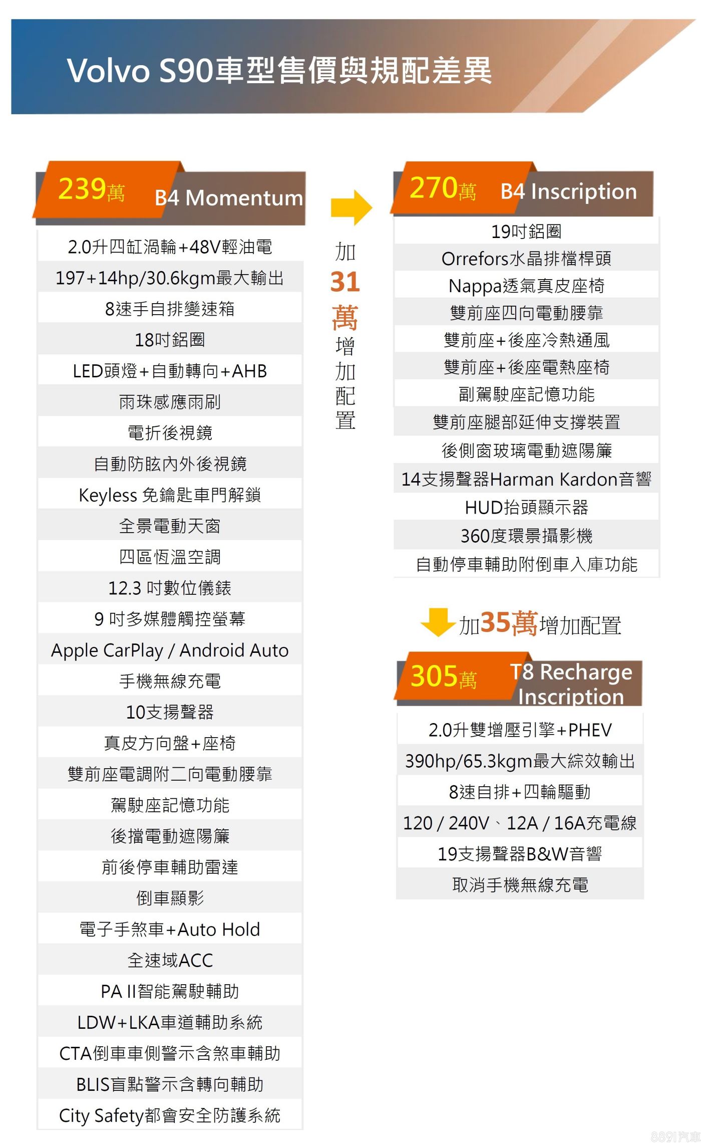 Volvo小改款S90今年2月亮相,國內近期也在官網釋出相關資訊,將規劃有B4 Momentum、B4 Inscription、T8 Recharge Inscription三車型編成,建議售價依序為239、270、305萬。向原廠詢問得知,官網率先批露小改款S90規配及價格,不過正式發表日期未定。
