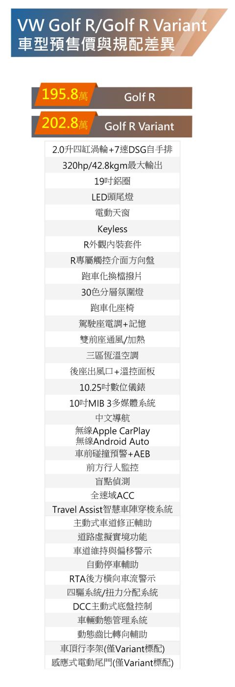 VW Golf R和Golf R Variant分別開出195.8、202.8萬元之預售價,可以6.5萬之代價,選配R-Performance套件,重點配備如附表。