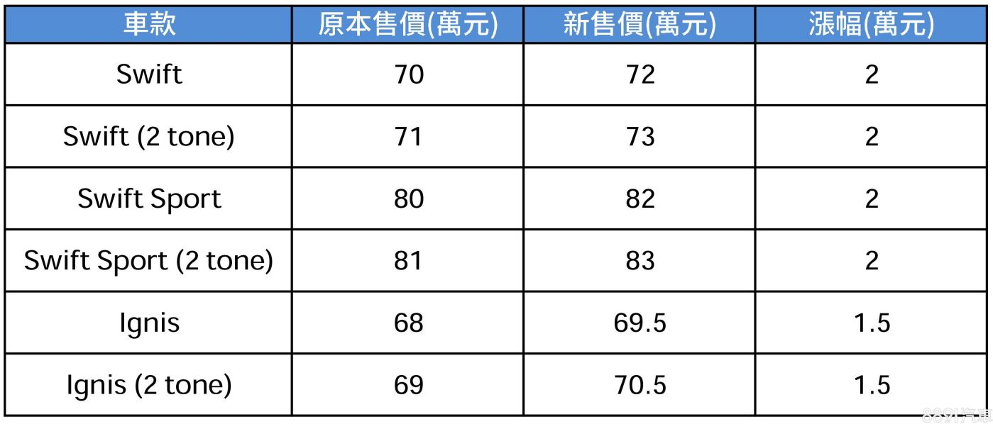 因疫情緣故,反映全球原物料價格上漲,Suzuki於近日公佈Swift、Ignis兩款車型微幅調升,依據下列表單所列,Swift全車系包含Sport車型、雙色在內,售價統一上漲2萬元,入手門檻來到72萬元;Ignis雙車型則有1.5萬元漲幅,入手門檻為69.5萬元。