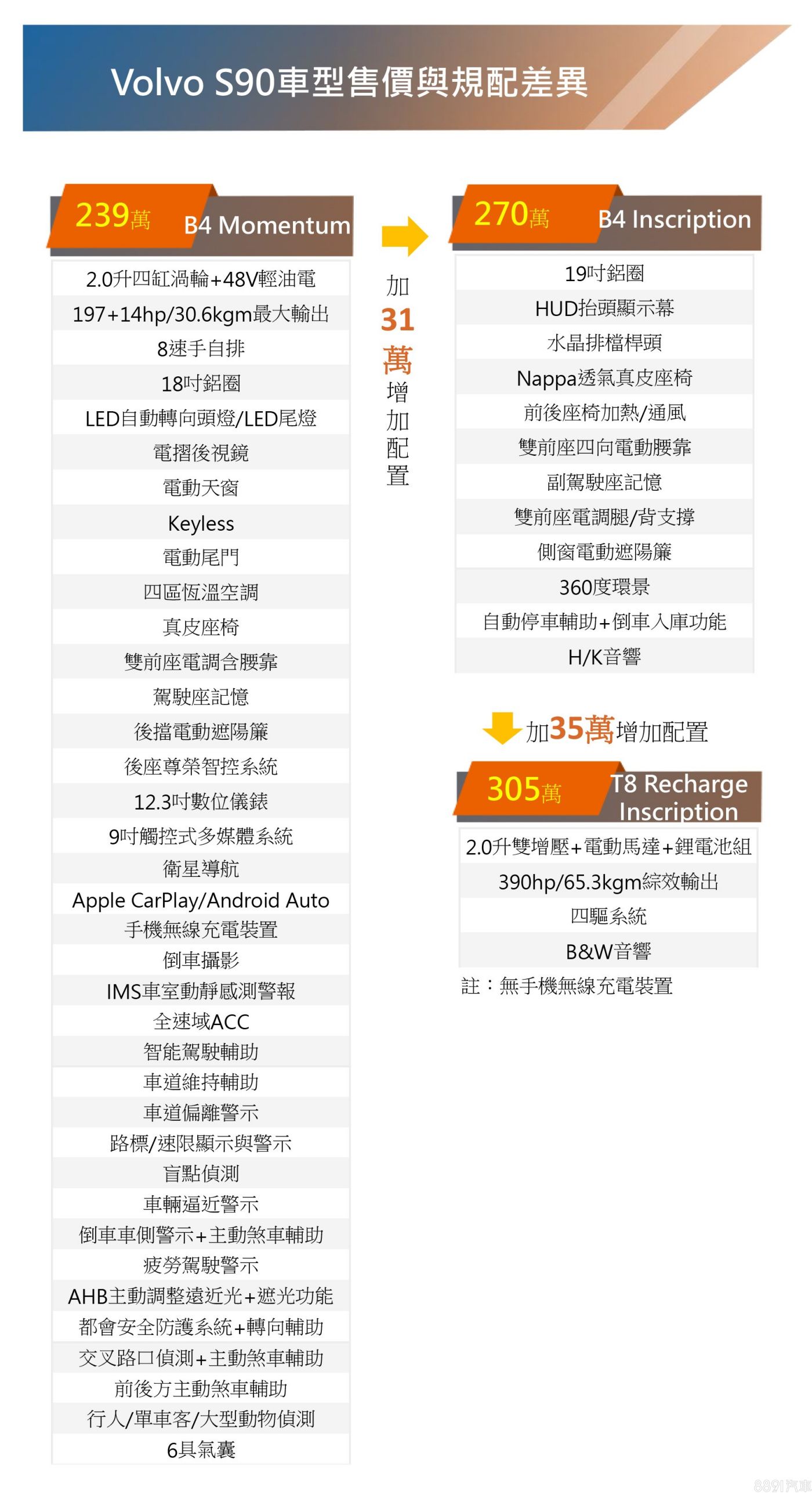 導入台灣的小改款S90提供B4 Momentum、B4 Inscription、T8 Recharge Inscription三車型,售價依序為239、270、305萬元。