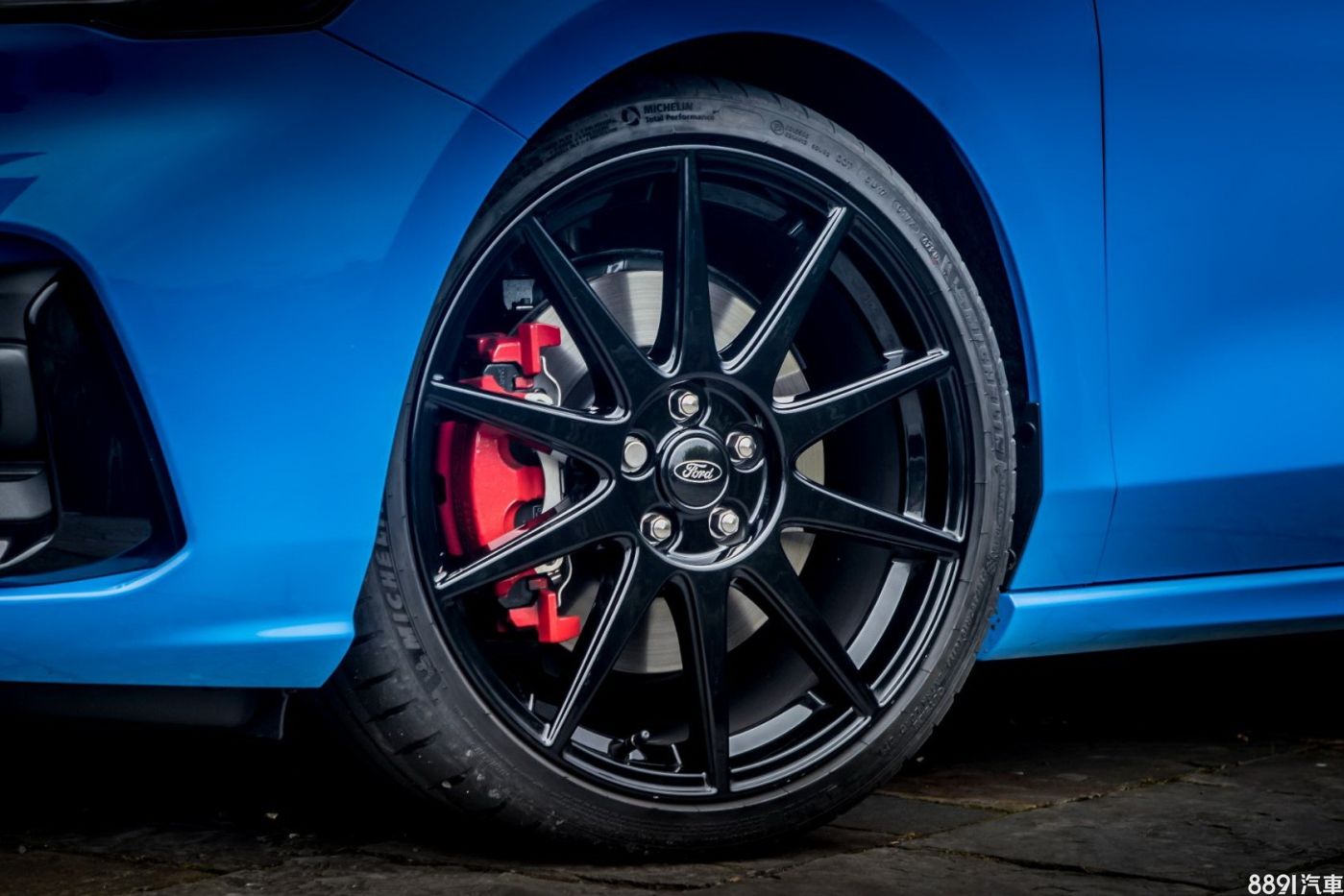 新車搭配的是19吋輕量化鋁圈,原廠表示對減輕簧下重量有所助益,至於米其林Pilot Sport 4S配胎,以及前330mm、後302mm之碟盤和能增添性能味的紅色卡鉗,則均比照一般版Focus ST辦理。