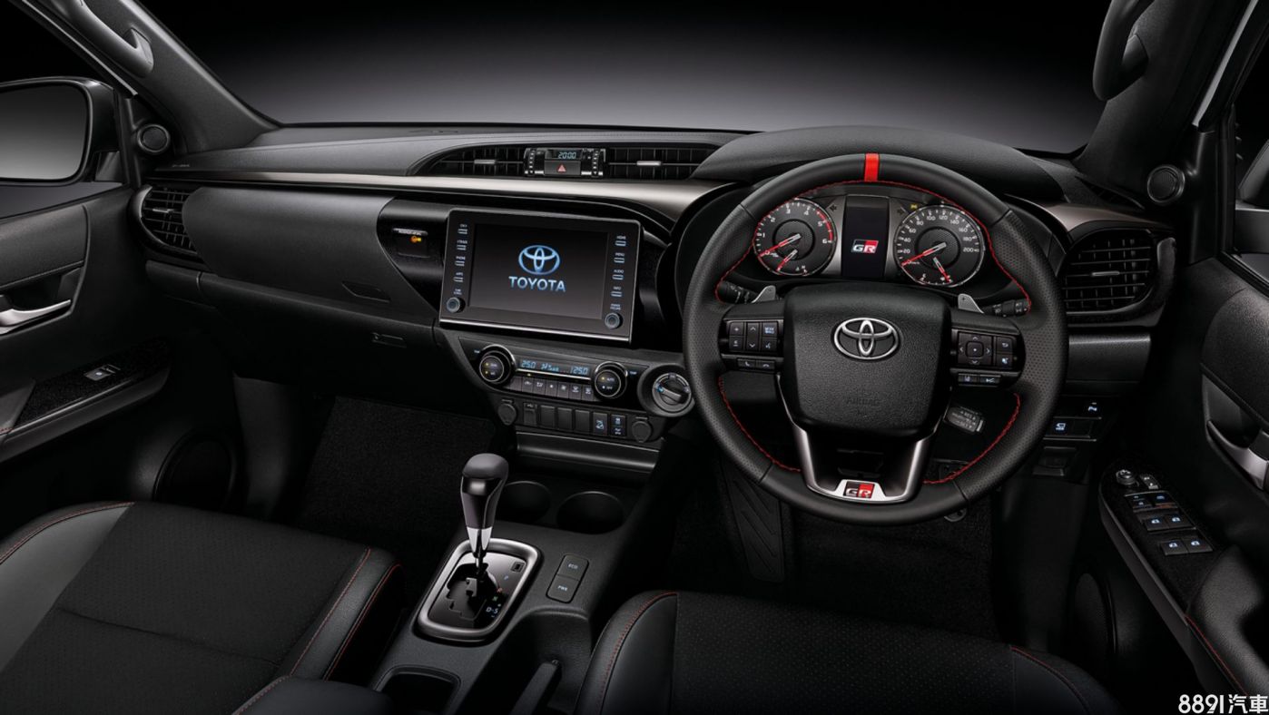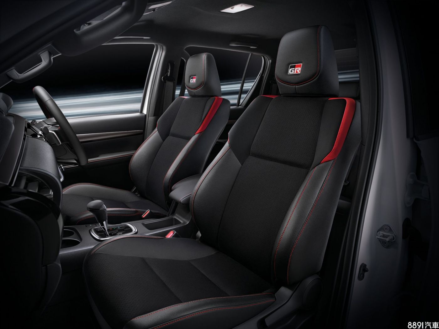 內裝部分維持Hilux現有架構,僅在細節處添加紅色縫線,方向盤的配置頗有「誠意」,除了下緣GR Sport專屬銘牌外,12點鐘方向也縫上紅色指標線。
