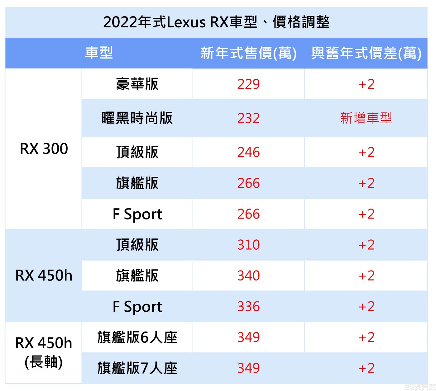 據了解,和泰汽車已向經銷商發出2022年式RX車系售價調漲資訊,預料會比現款漲2萬,同時於RX 300追加新車型曜黑時尚版。雖然官方並未說明漲價原因,不過根據日媒報導,基於國際原物料價格上漲的緣故,豐田已同意日本製鐵的漲價要求,或許也反映在製車成本上。