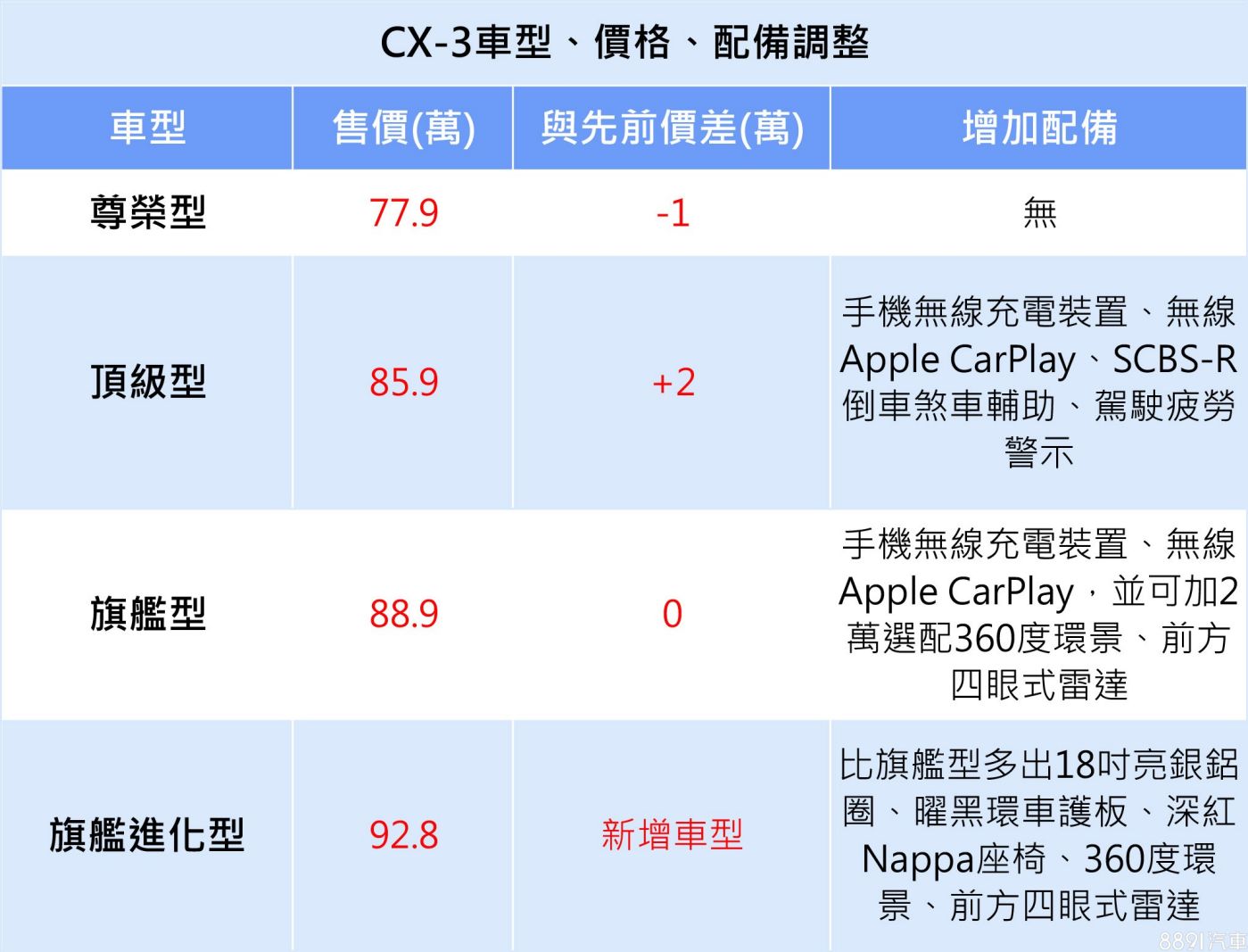 新年式CX-3車系除了既有的尊榮型、頂級型、旗艦型外,再追加頂規新車型:旗艦進化型,分別開出77.9、85.9、88.9和92.8萬之售價,其中入門版本售價下修1萬,二階的頂級型略漲2萬,旗艦型則無變動。