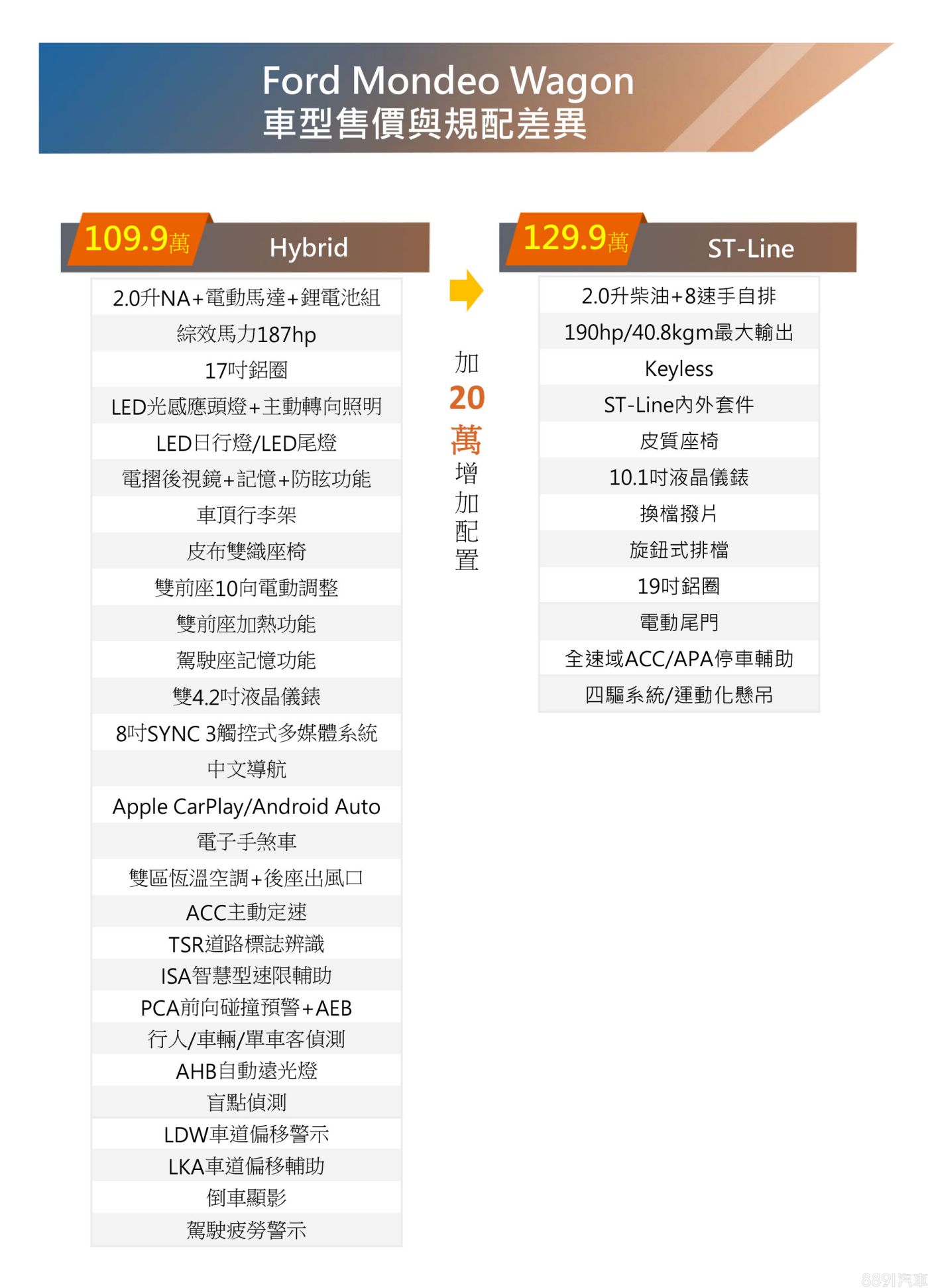 除了已展開預售的Mondeo Hybrid Wagon,新年式Mondeo Wagon也提供柴油版本,雙動力2車型,前者售價109.9萬(較預售價下修0.1萬)、後者開價129.9萬元。