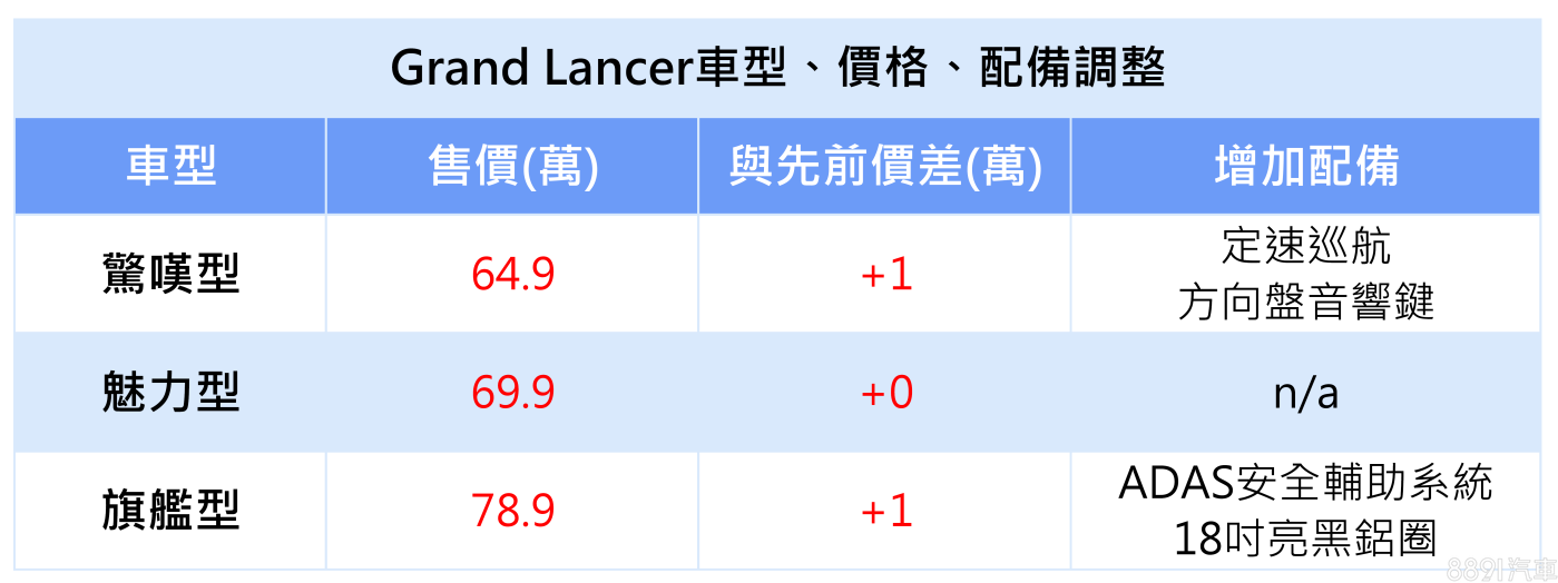 2022年式Grand Lancer規劃驚嘆型、魅力型、旗艦型3車型,正式售價依序為64.9、69.9、78.9萬,除了中階車款持平外,其餘車型皆有調漲,目前中華三菱另針對驚嘆型開出62.9萬的限時優惠價。