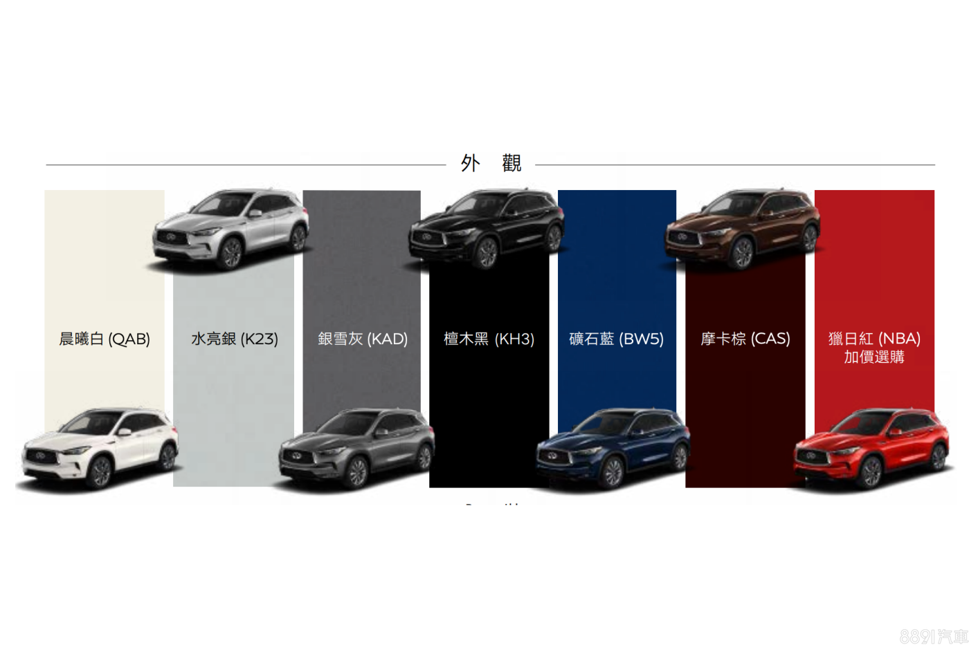 此外新年式QX50除原有的晨曦白、水亮銀、銀雪灰、檀木黑、礦石藍、獵日紅6個車色外,再追加新增「摩卡棕」,使車色塗裝達7種選擇,而在全球車用晶片持續短缺的狀況下,為避免車主久候,QX50的2022年式新車已經搶先到港,現車不用等。