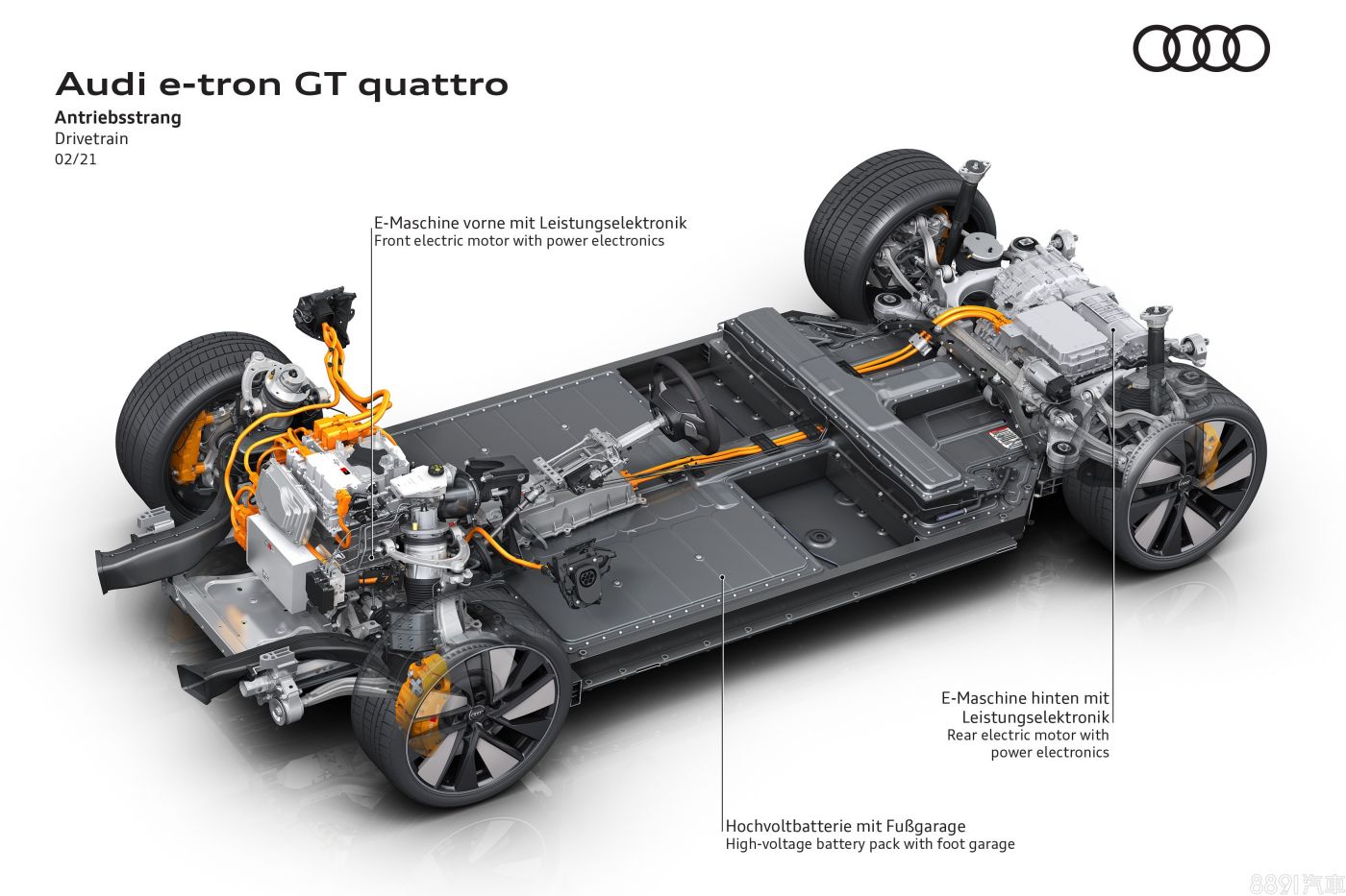 由於同採J1模組化平台做為開發基礎,e-tron GT與Porsche Taycan共享動力單元及800V電能架構。在雙馬達和雙速變速箱的驅動下,標準款即具476hp/64.2kgm輸出,並在Boost超增壓模式下可短暫提升至530hp/65.2kgm,0~100km/h加速最快4.1秒完成,極速245km/h。