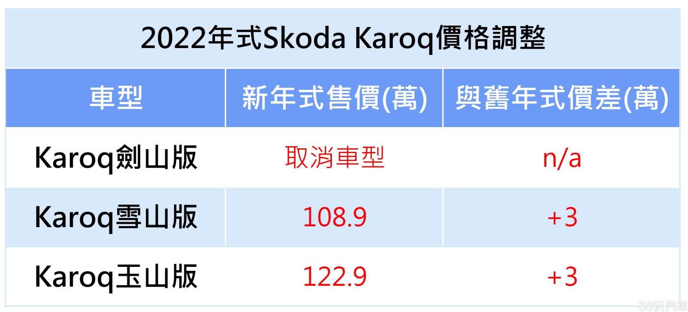 首先,新年式Karoq預計縮編,原擔綱最入門的劍山版將被移除,保留雪山版與玉山版兩車型,新車售價將上漲3萬。