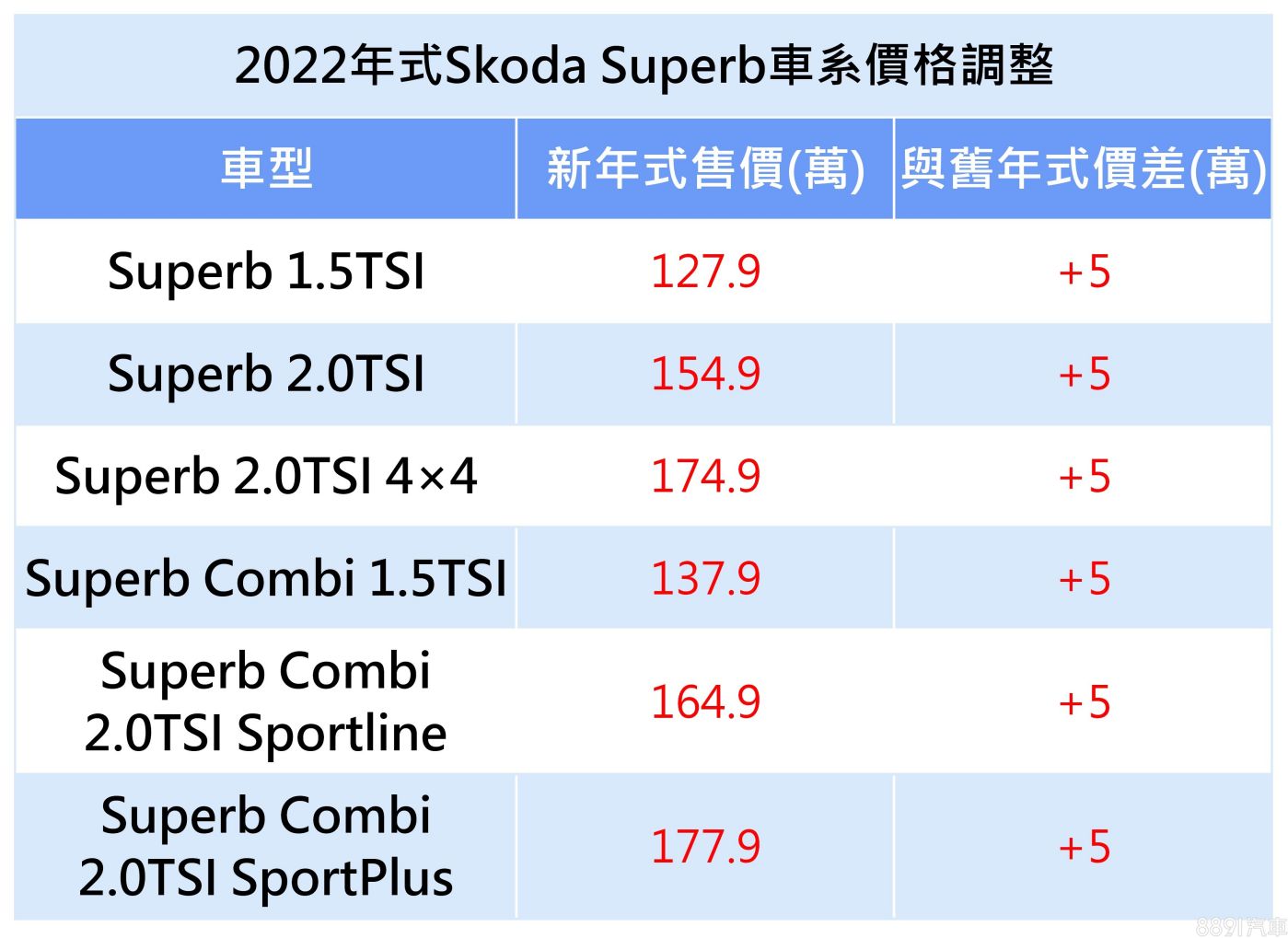 Superb與Superb Combi編成維持各3車型不變,依舊有1.5/2.0升汽油動力可選,售價方面全車系均上調5萬。