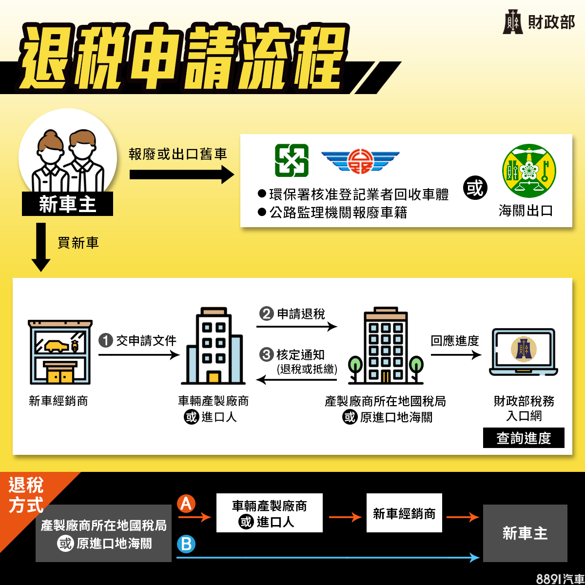 流程上,申請者可將舊車交由核准登記的業者回收車輛,並向監理機關報廢車籍,或將舊車出口,而購車時將退稅申請交由新車經銷商代為處理即可,申請期間並可自財政部稅務入口網查詢處理進度。