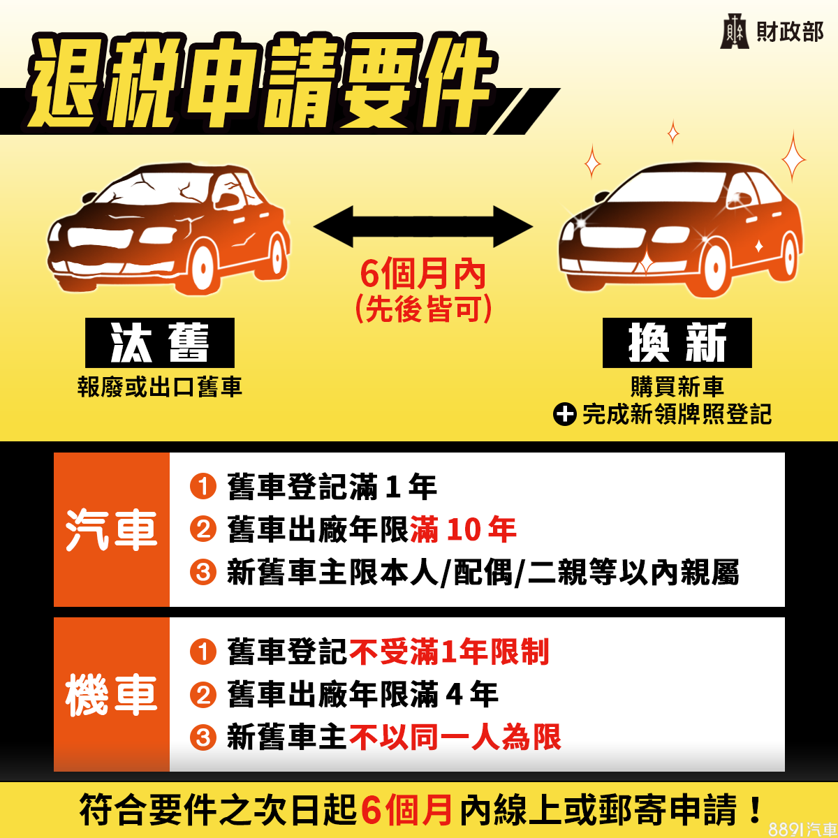 若想申請汽車舊換新退稅,舊車報廢或出口及新車掛牌須在半年內完成,不限先後順序,且舊車登記須滿1年,而新車車主僅限本人、配偶及二等親內親屬。不過今年修法時,政府也針對退稅資格略做調整,將「舊車」認定標準自「出廠滿6年」提高至「出廠滿10年」,以保障二手市場的流通空間。