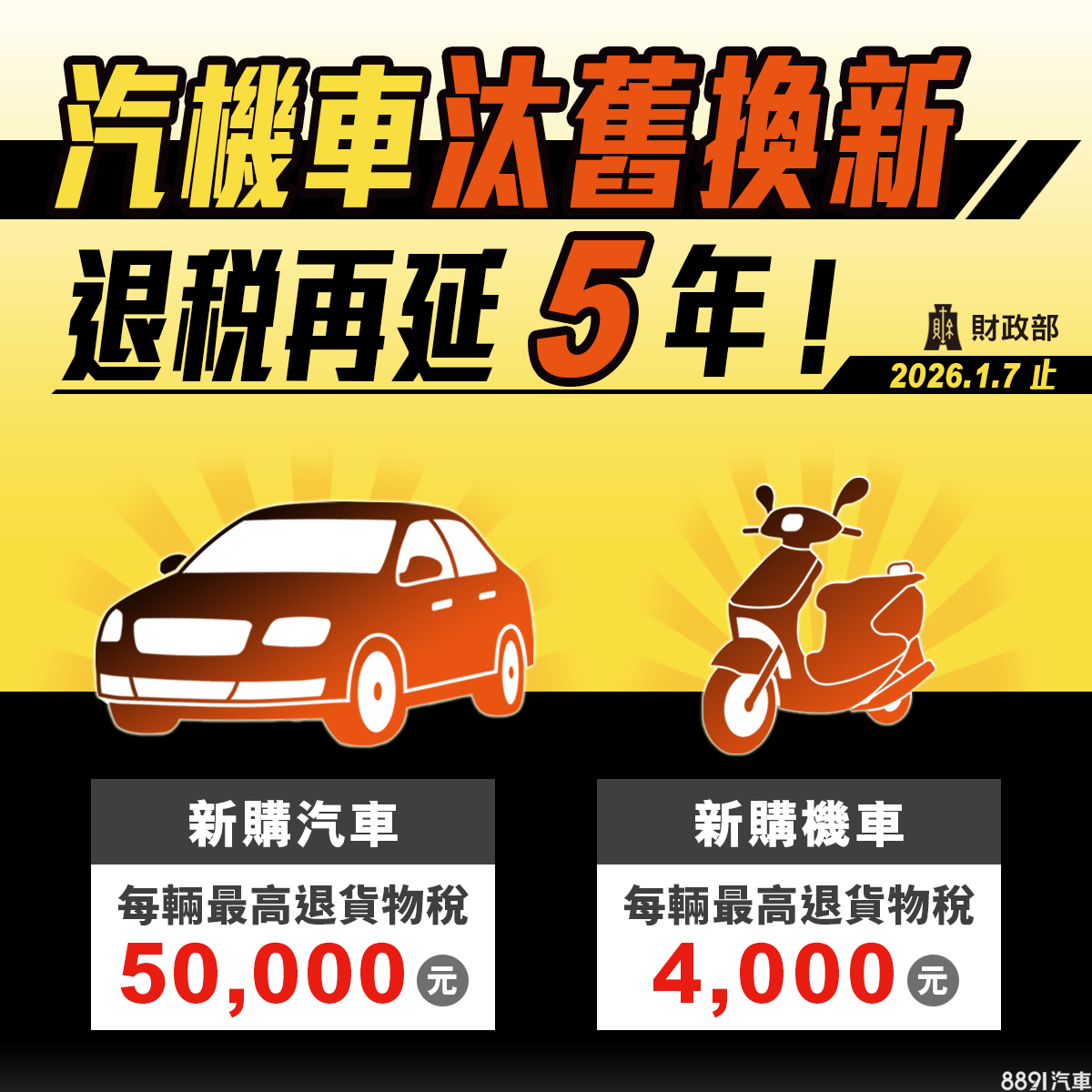 若想要新購純電車來申請舊換新退稅就得特別注意,由於目前純電車輛適用貨物稅減半徵收,且完稅價140萬元以下免徵,因此退稅額可能受應稅部分影響而受限。簡單說,若新購的純電車款原本貨物稅應稅額就不足5萬元,當然也無法「退回」舊換新政策最高的5萬元,至於實際退稅金額將因完稅價而不同。